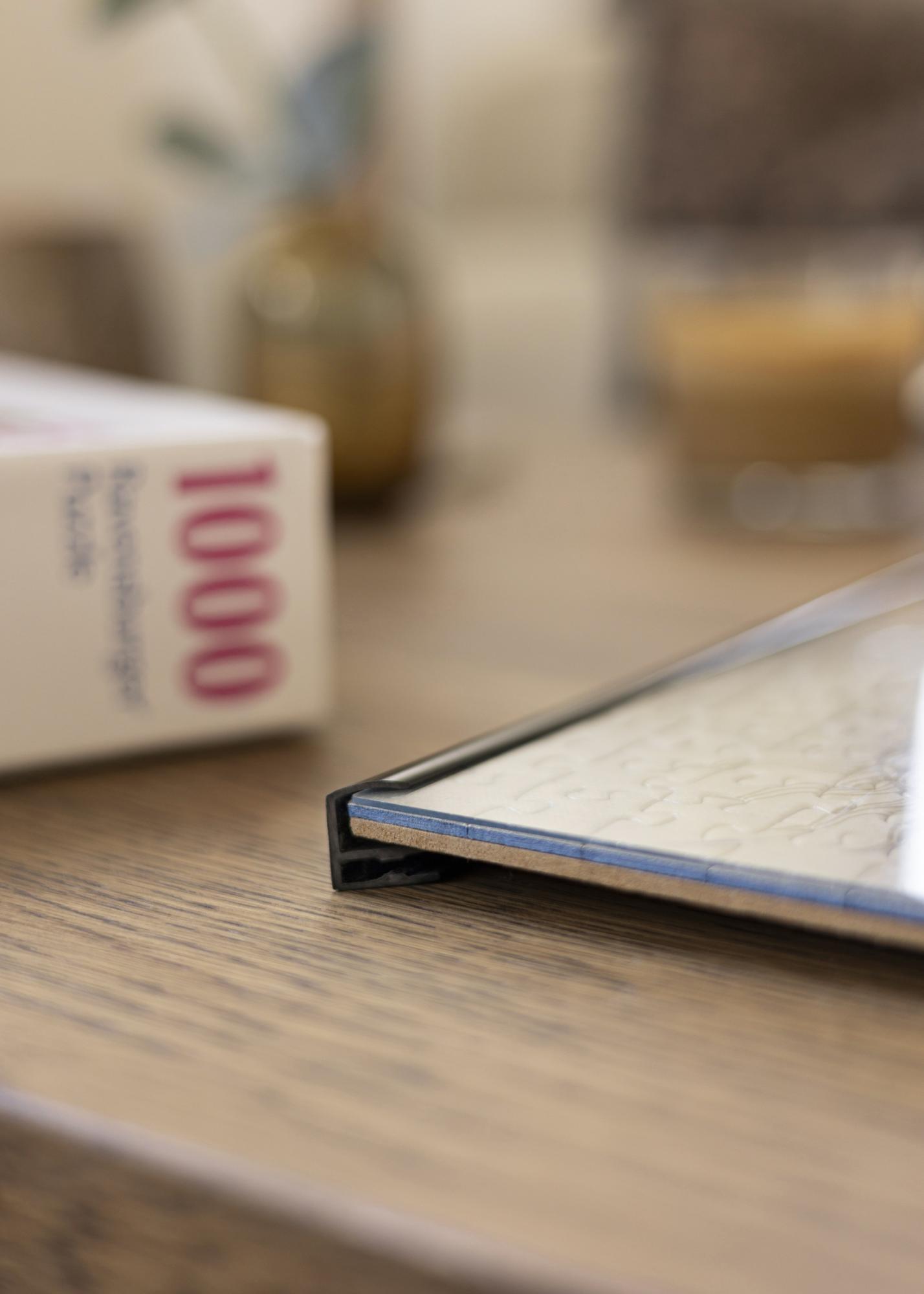 Pussel i storleken 50x66,5 cm blir enkelt att rama in med denna svarta pusselram. Pusslet byggs direkt på bakstycket och akrylglaset läggs ovanpå, vilket gör monteringen trygg och smidig.