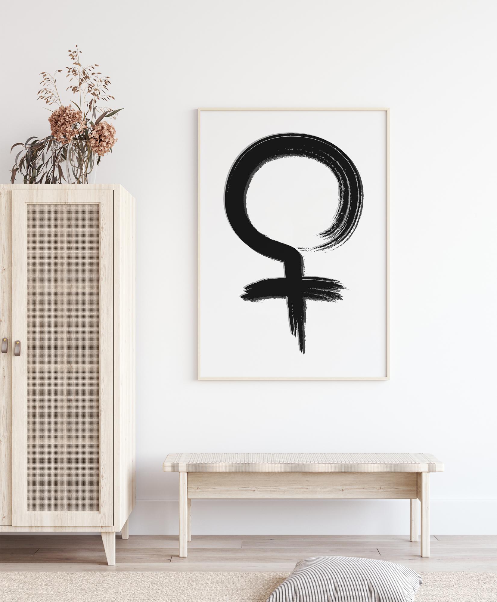 Ett enkelt svartvitt tryck som illustrerar tecknet för kvinna med en ofullständig cirkel. På en vit bakgrund tonar den svarta symbolen ut mot slutet av ringen. En perfekt poster att hänga upp i en kvinnlig miljö.