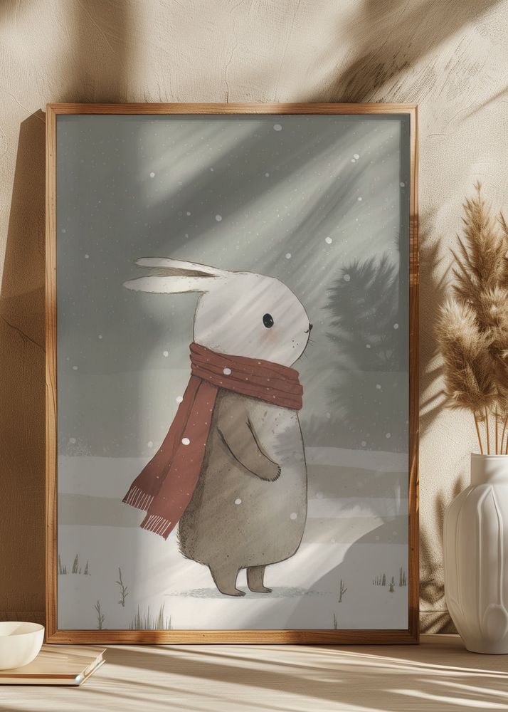 Skapa en mysig atmosfär i ditt hem med denna charmiga poster som skildrar en bedårande illustrerad kanin klädd i en varm röd halsduk. Den lugnande scenen fångar kaninens förtjusande stund under ett ljust snöfall, vilket ger en känsla av ro och vinteridyll. Detta motiv är perfekt för dig som vill lägga till en söt och lugnande touch i din inredning.