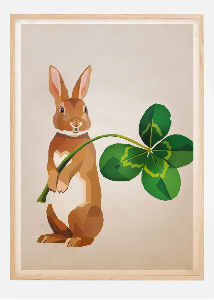 En rolig poster med en söt kanin som håller en fyrklöver mellan sina två framtassar. Mot en beigefärgad bakgrund sitter den brunvita kaninen på sina bakben och tittar rakt in i kameran. Ett gulligt tryck som kan tillföra lite tur till ditt hem.