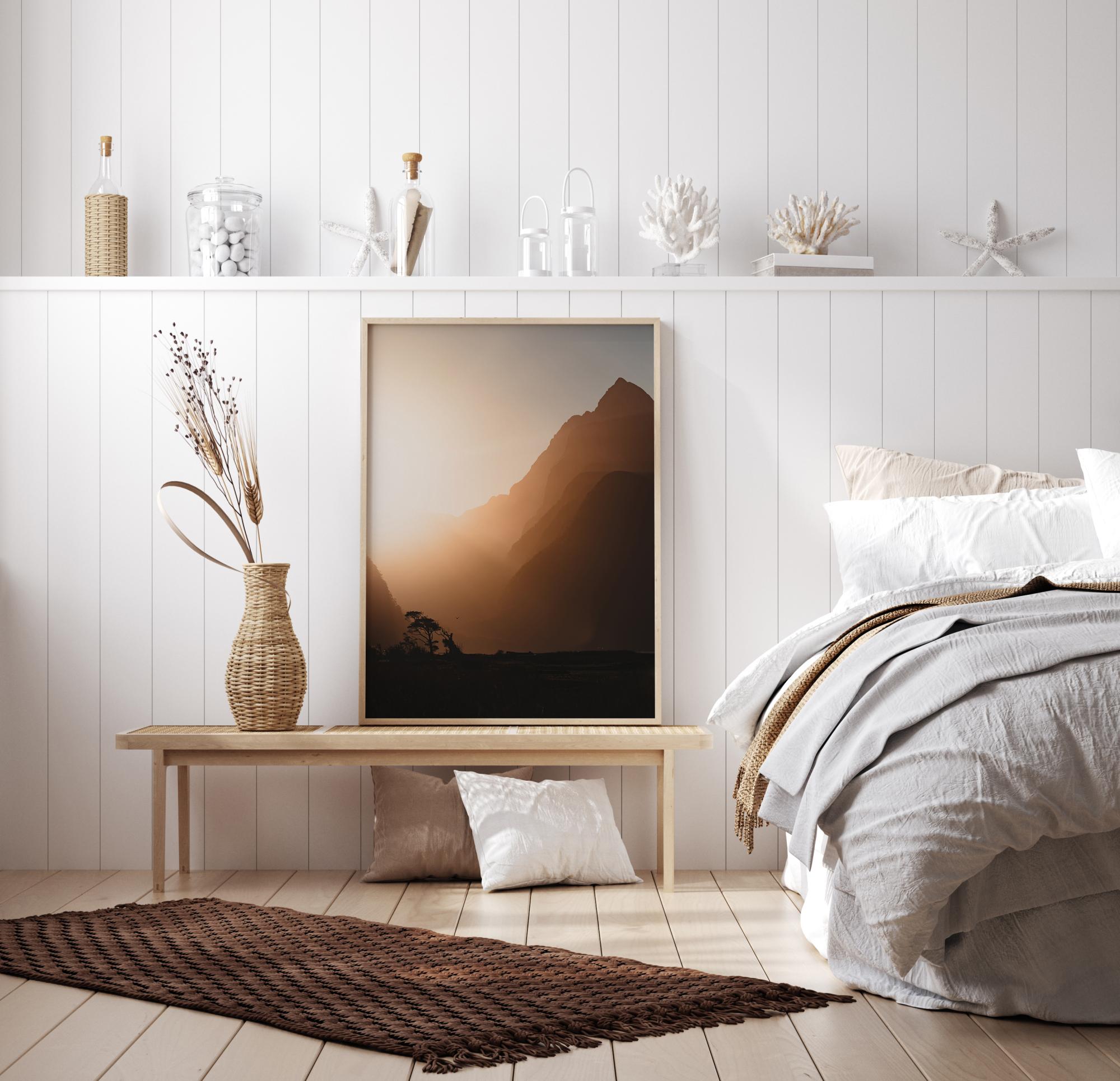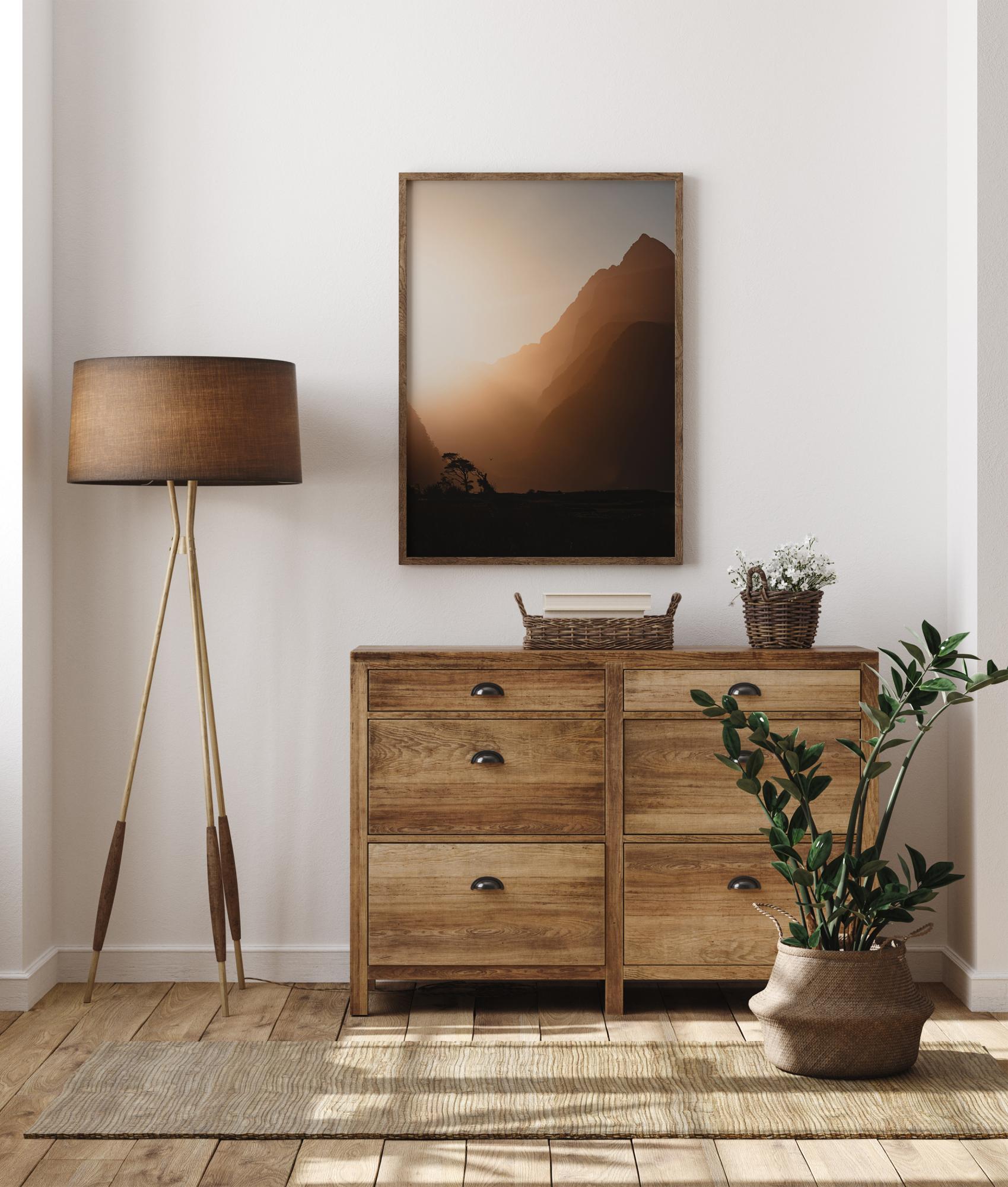 En vacker, naturskön poster med ett landskap i solnedgång. Gapet mellan kullarna lyser med ljusa bländande strålar och skapar en mörk förgrund. De avlägsna träden och fågeln manifesterar livets existens. Dekorera ditt sovrum med denna livfulla bild.