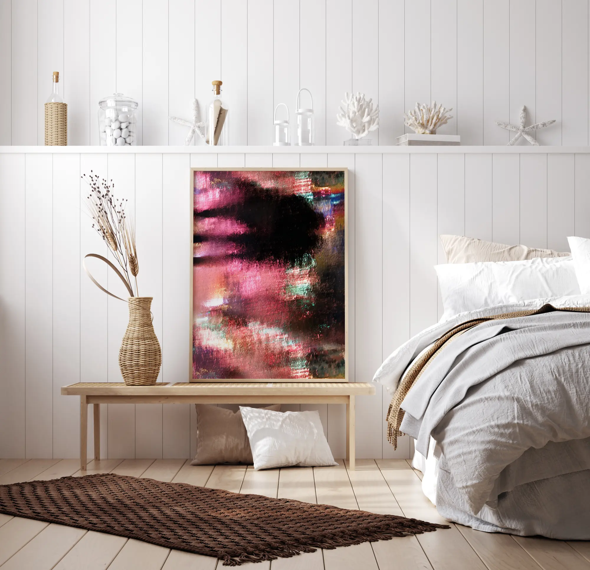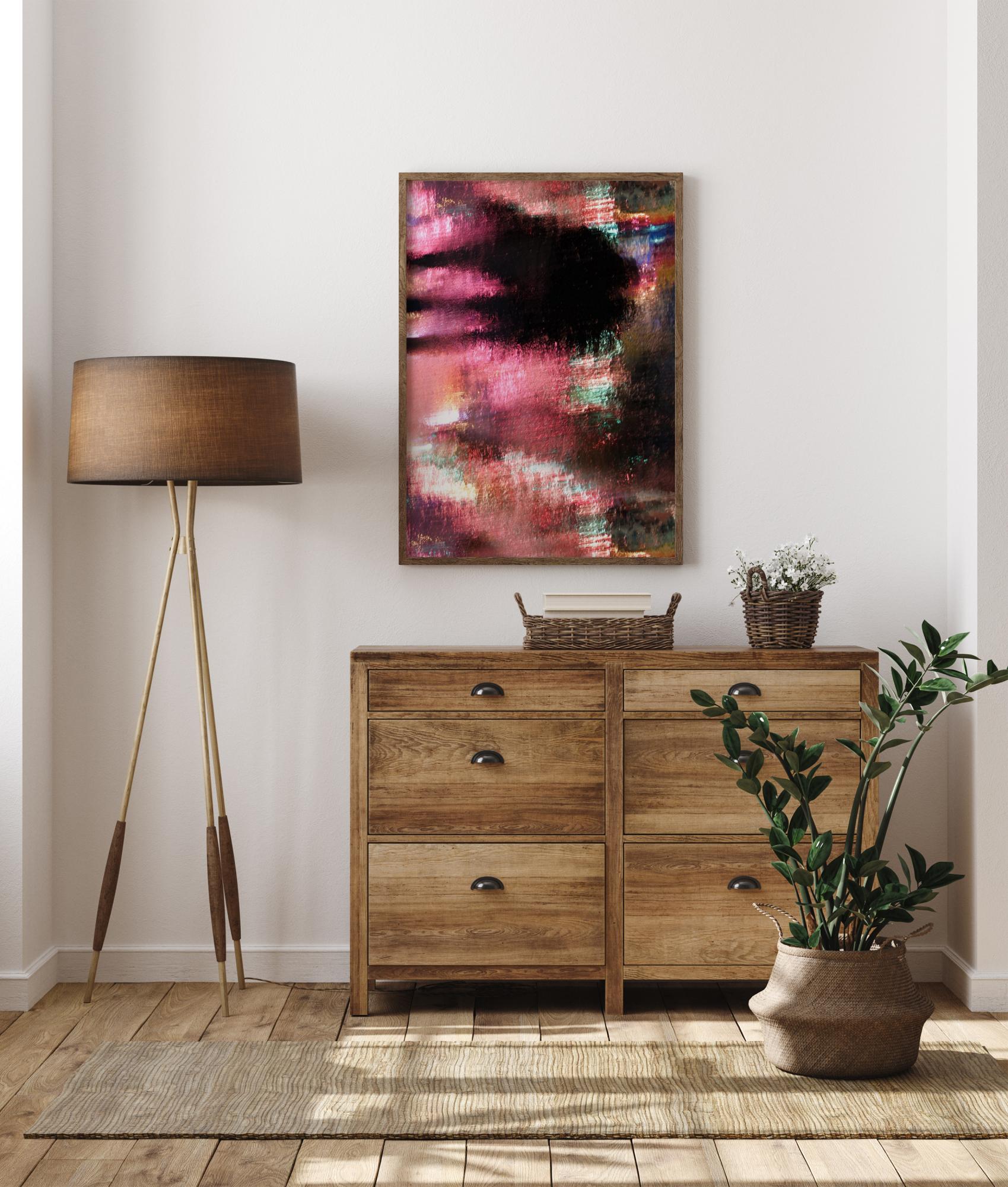 En perfekt blandning av färger med rosa toner dominerar detta flerfärgade tryck. Överst på trycket finns ett svart område som skapar en känsla av djup. Till höger om det svarta området finns en vertikal rörform i rött och grönt. En perfekt poster för att ge en touch av färg till en neutral vägg.