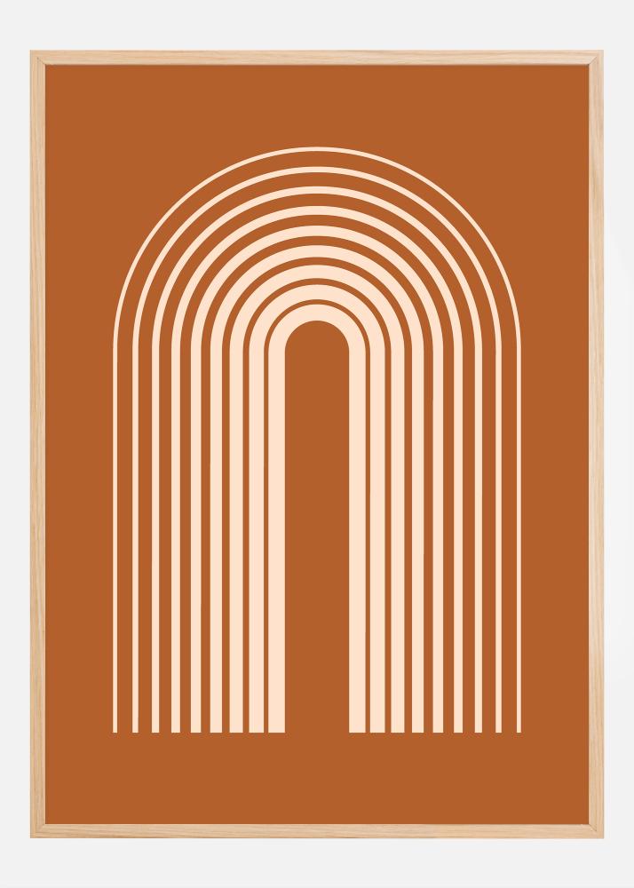 Denna poster med ett abstrakt halvbåge-mönster är en hyllning till modern konst och design. Mönstret framstår som en serie av perfekt symmetriska bågar i varma, tonala färger som ger ett lugnande och rytmiskt visuellt uttryck. Den stadigt mörkare terrakottabakgrunden erbjuder ett djupt och rikt landskap för de ljusare linjerna att framstå från, och skapar en dynamisk kontrast som fängslar blicken.