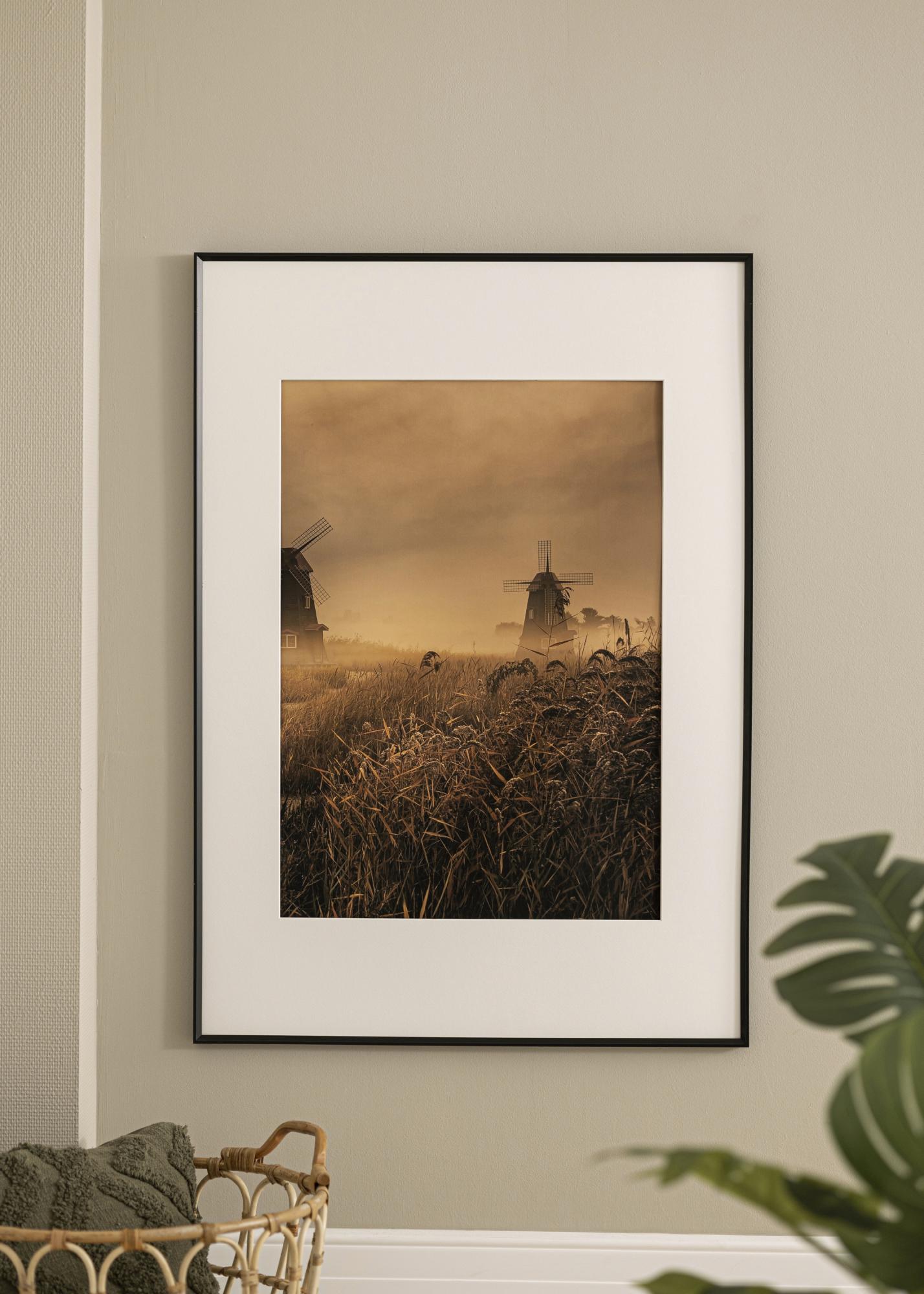 Den matta svarta finishen på ramen kompletterar den vita passepartouten och skapar en klassisk kontrast som passar i alla rum. Ramen är utrustad med praktiska metallhängare på baksidan, vilket gör det enkelt att hänga upp din bild antingen horisontellt eller vertikalt, beroende på motivets orientering och ditt personliga utrymme.