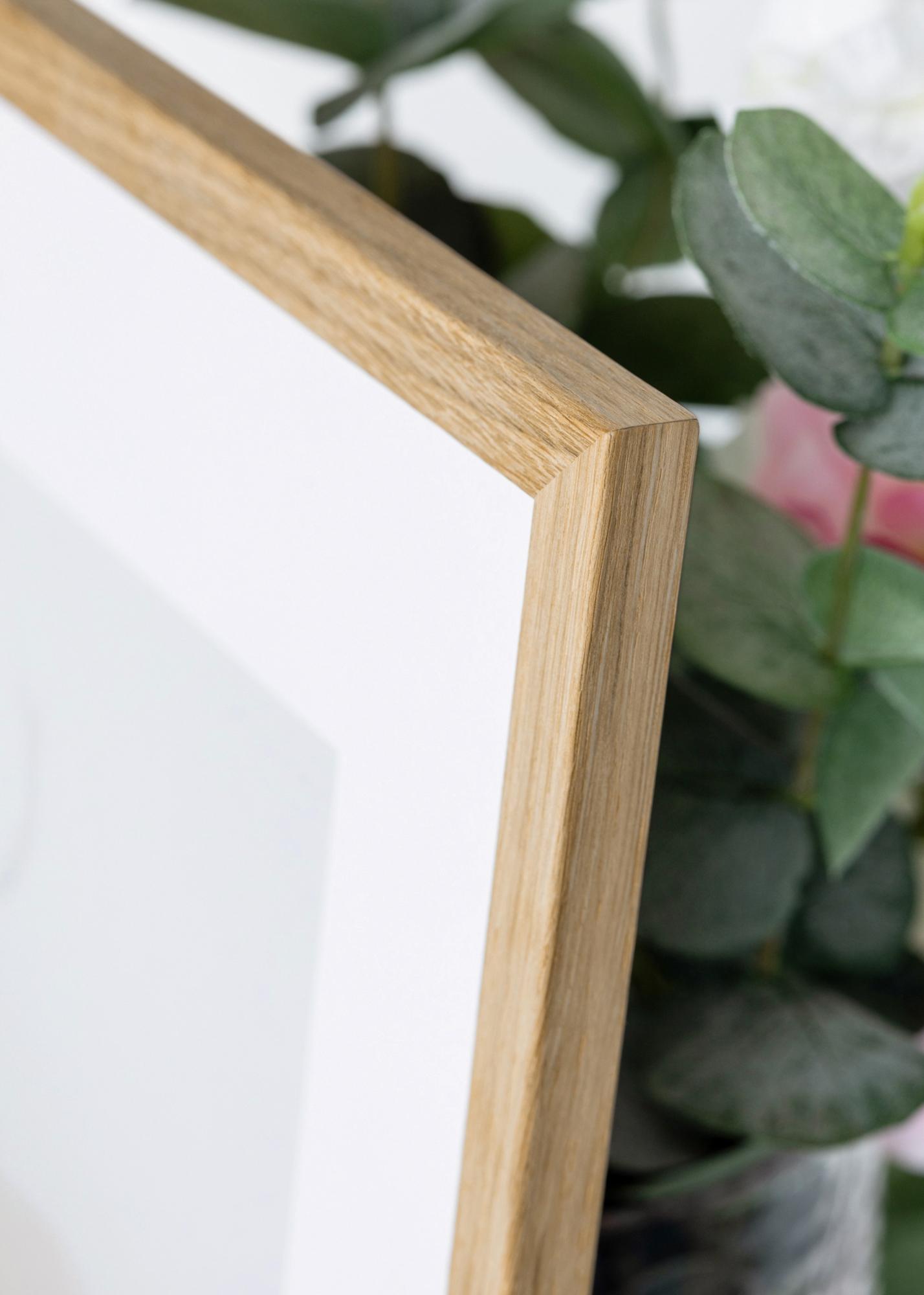 Ibland får vi frågan varför ramen är gjord av ekfaner och inte äkta solid ek om de nu ska vara en kvalitetsram. Anledningen till detta är att det är svårt att få en kontrollerad yta när det rör sig om äkta Ek utan de blir ofta färgskiftningar på olika delar av träet vilket i vissa sammanhang passar bra. Men på en ram riskerar det bara att se ut som att delar av ramen är missfärgad.