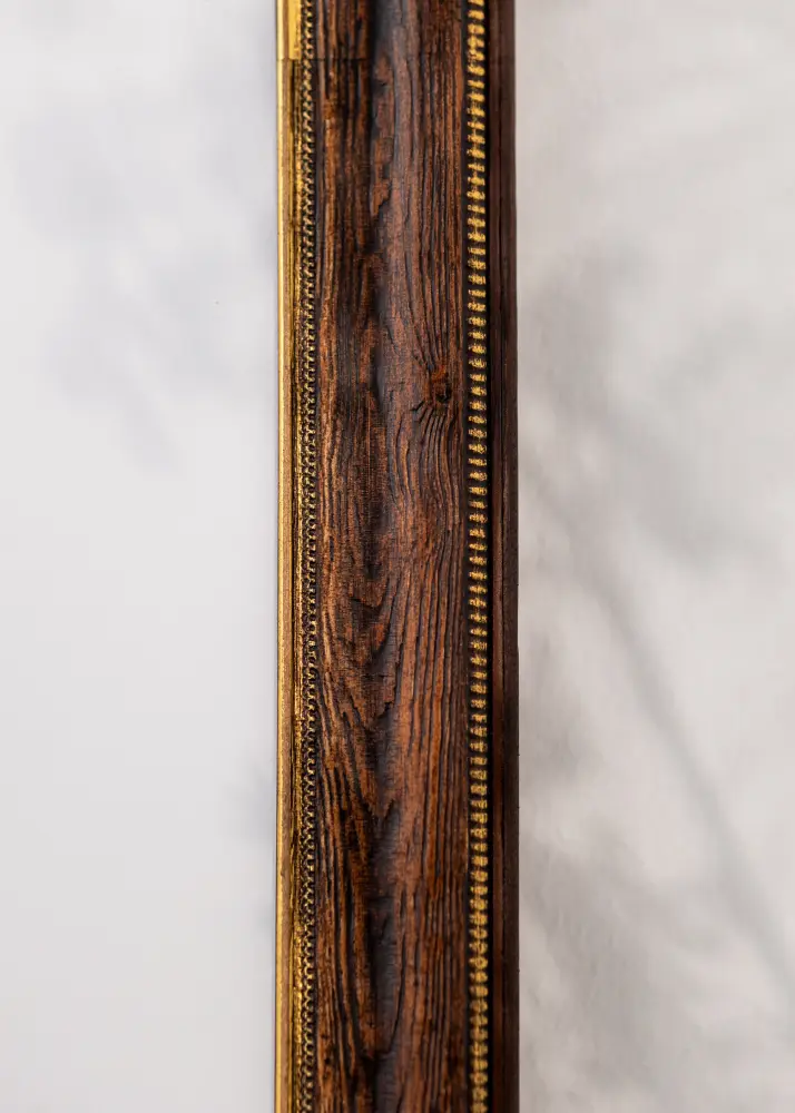 Denna eleganta fotoram i storleken 21x29,7 cm är en perfekt kombination av rustik charm och klassisk elegans. Tillverkad av högkvalitativt trä, har ramen en djup brun färg med dekorativa gulddetaljer längs innerkanten. Trästrukturen är tydligt synlig och ger en varm och naturlig känsla, medan de guldfärgade inslagen tillför en sofistikerad touch som passar utmärkt i traditionella och vintageinspirerade inredningar.