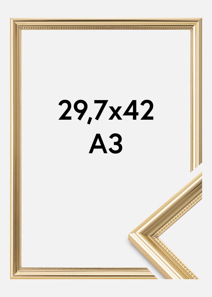 Ge dina väggar en touch av elegans med denna 29,7x42 cm (A3) guldfärgade fotoram. Med sin profilerade ram i retrostil, tillför den en klassisk charm till ditt hem. Ramlistens bredd på 20 mm och djupet på 17 mm ger en distinkt och raffinerad kant till dina favoritbilder eller konstverk.