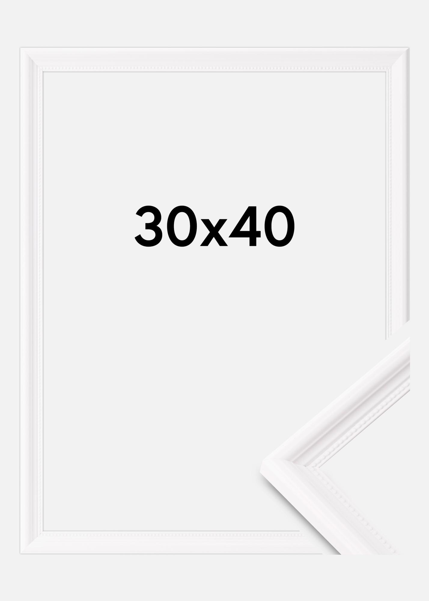 Upptäck den eleganta och tidlösa designen med vår vita fotoram i storleken 30x40 cm. Denna tavelram är perfekt för att framhäva dina favoritbilder eller konstverk med sin profilerade ramlist i retrostil. Med en bredd på 20 mm och ett djup på 17 mm, ger ramen en distinkt och sofistikerad känsla till ditt utrymme.