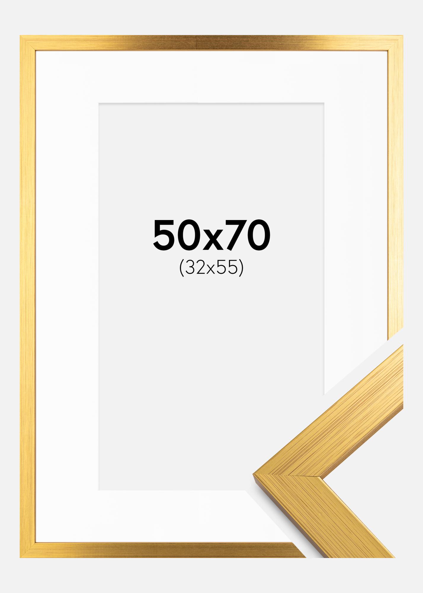 Ramen är tillverkad med en matt guldfinish som tillför en touch av lyx till din inredning. Med en bredd på 22 mm och ett djup på 15 mm har ramen en robust konstruktion som ändå bibehåller en elegant profil. Den vita passepartouten matchar perfekt och är anpassad för bilder i storleken 33x56 cm, medan ramens yttermått är 53,4x73,4 cm.
