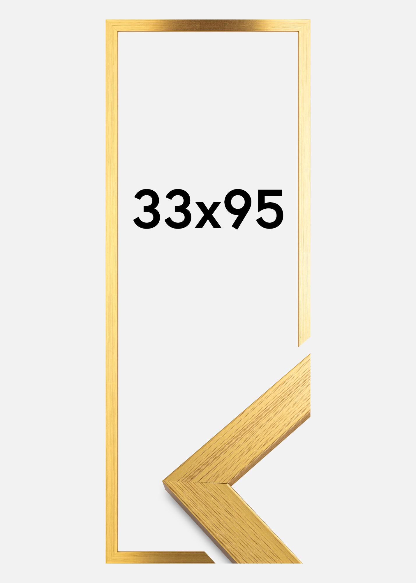 Skapa en lyxig känsla i ditt hem med denna eleganta 33x95 cm guldfärgade guldram. Med sin klassiska design och skimrande yta blir den ett blickfång på vilken vägg som helst. Denna fotoram är inte bara en stilfull inredningsdetalj, utan också praktisk tack vare de medföljande metallhängarna som tillåter både horisontell och vertikal upphängning.