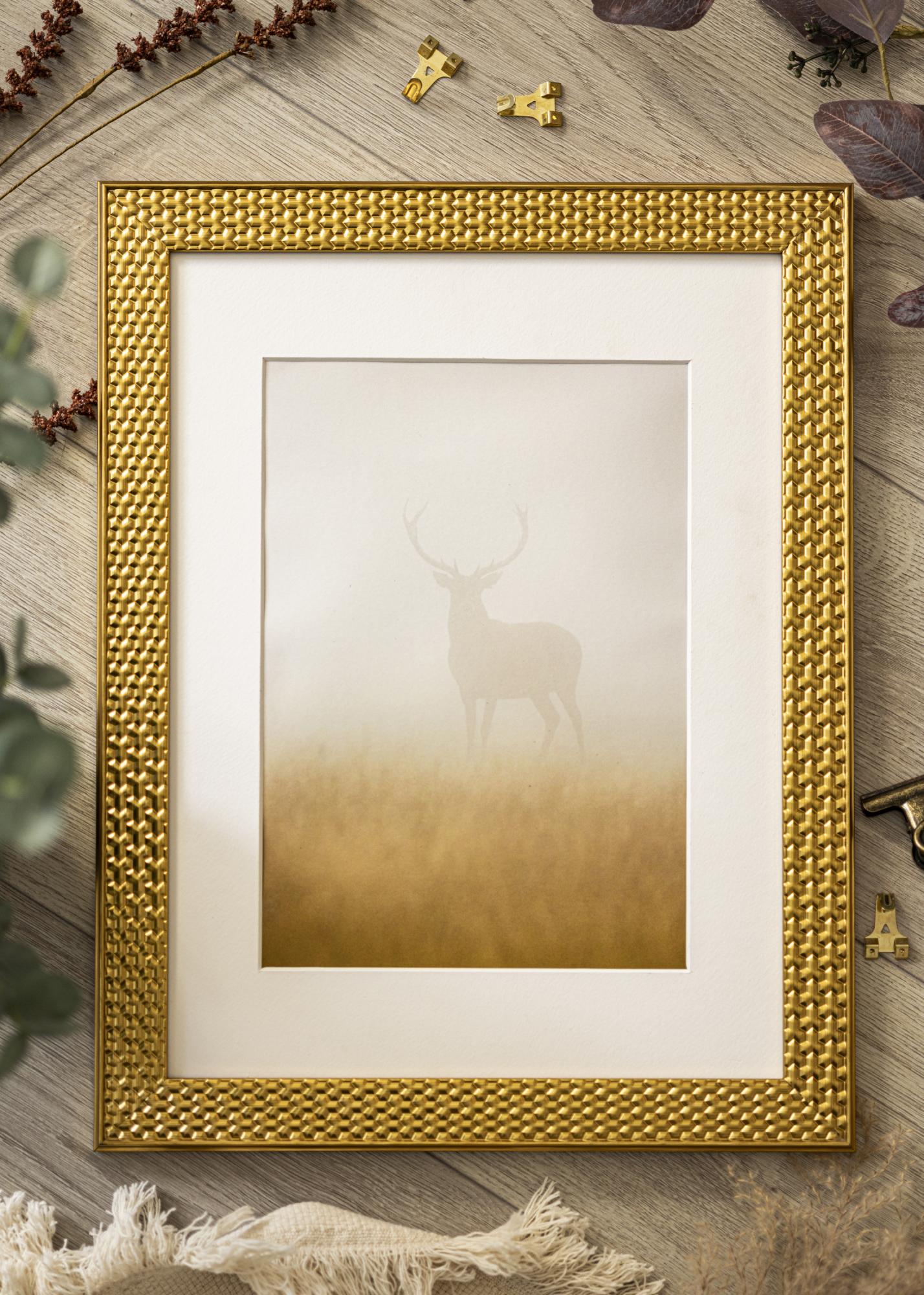 Förvandla dina bilder till konstverk med vår eleganta guldfärgade ram, komplett med en vit passepartout. Denna ram är perfekt för att framhäva dina favoritbilder i storleken 31x41 cm. Med en bredd på 35 mm och ett djup på 17 mm ger den en robust och stilren inramning som passar i alla hem.