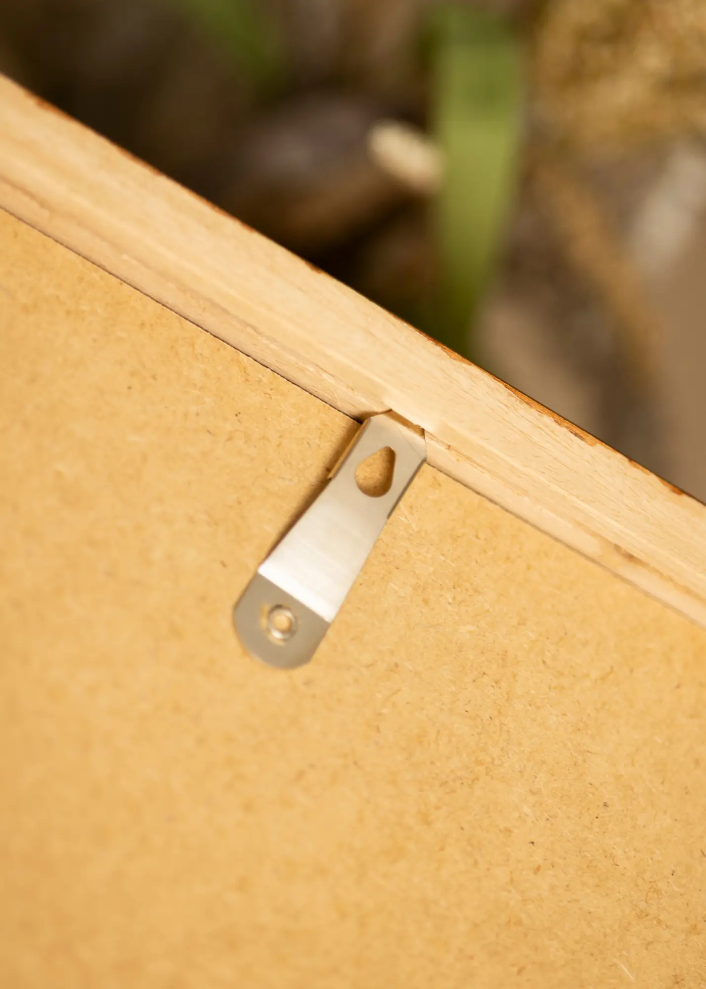 Tillverkad av robust ayosträ, erbjuder denna ram inte bara en estetiskt tilltalande design utan också en hållbar konstruktion. Dessutom är den tillverkad i Nederländerna och kommer med en praktisk metallhängare på baksidan, vilket gör det möjligt att hänga upp din ram både horisontellt och vertikalt för att passa ditt unika utrymme.
