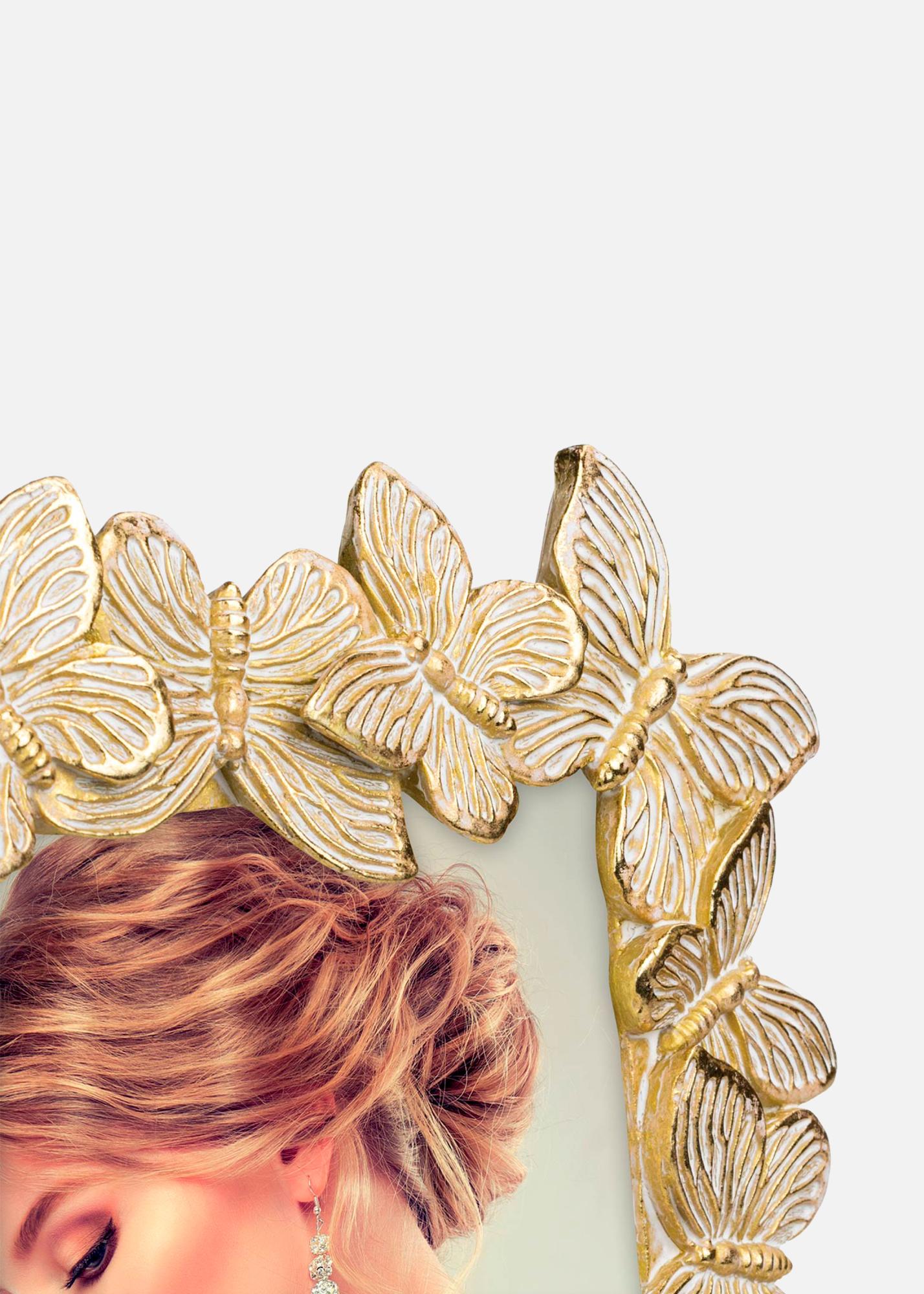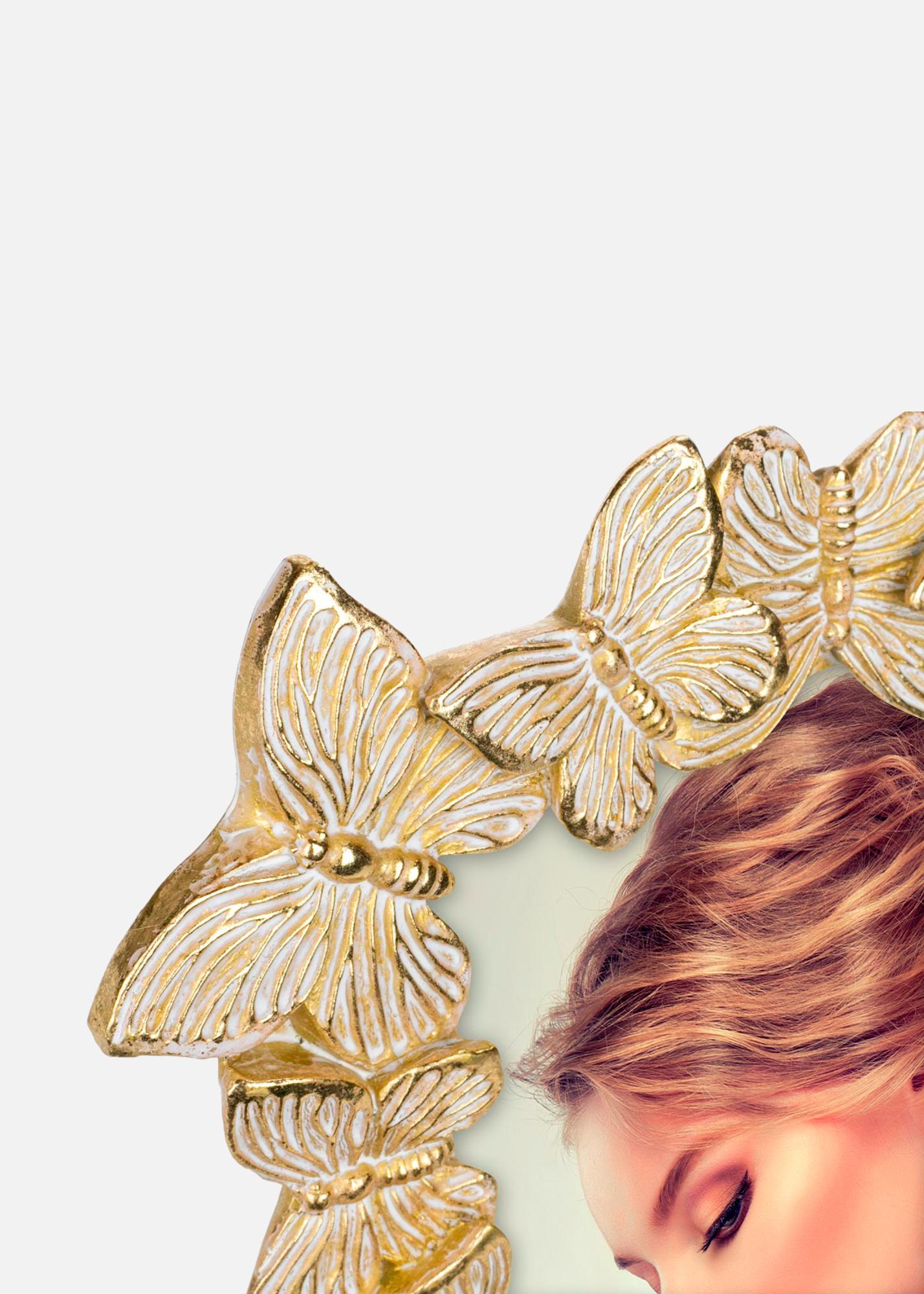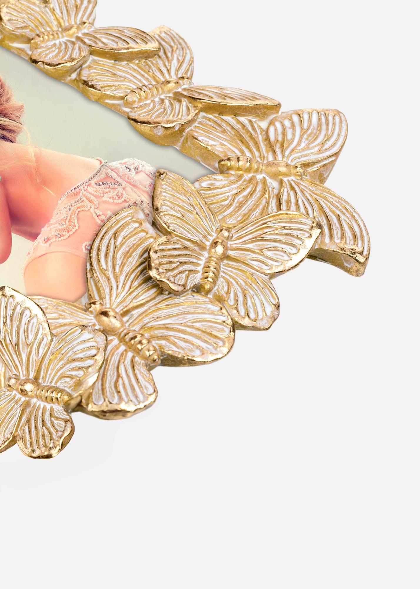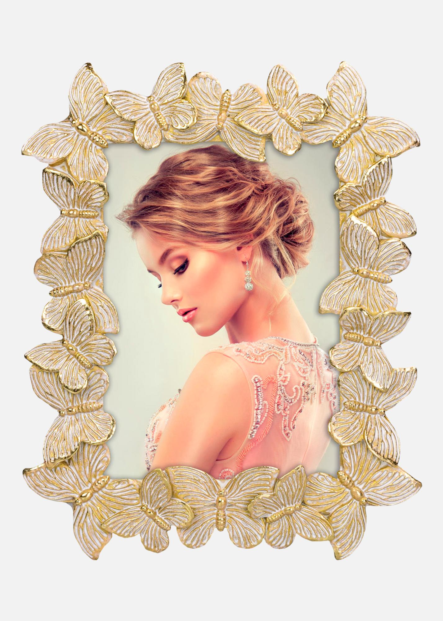 Upptäck den förtrollande skönheten hos vår 13x18 cm stora porträttram, en sann blickfångare för ditt hem. Denna unika fotoram pryds av en detaljrik ramprofil med fjärilar i guld och vitt, vilket ger en lekfull och elegant touch till dina favoritbilder.