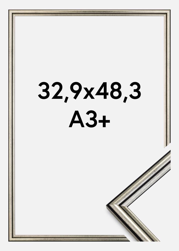 Upptäck den eleganta silverramen med dimensionerna 32,9x48,3 cm (A3+), en perfekt kombination av stil och funktion för dina favoritbilder eller konstverk. Denna fotoram är särskilt framtagen för att ge ett sofistikerat intryck med sina svartspräckliga detaljer och svarta linjer som diskret framhäver ramens design.