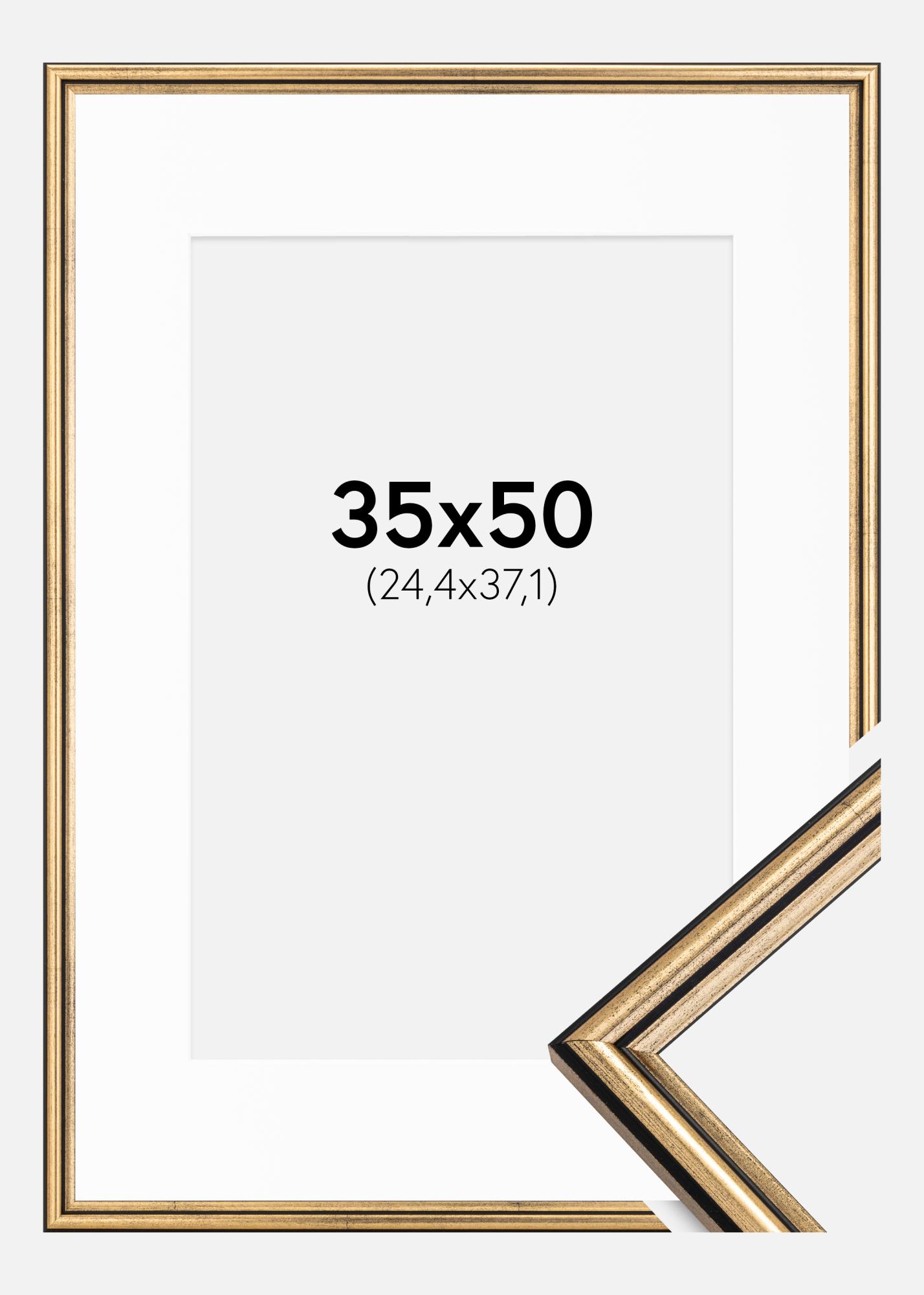 Förvandla dina favoritbilder till konstverk med en elegant guldram komplett med vit passepartout. Denna sofistikerade ram ger en lyxig inramning till dina 10x15 inches (25,4x38,1 cm) fotografier och skapar en visuell paus som förstärker motivet. Den vita passepartouten bidrar till att framhäva bilden och skyddar den samtidigt från att komma i direkt kontakt med glaset.