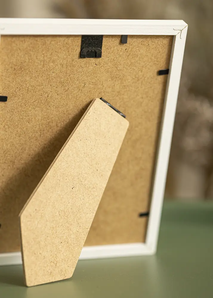 Denna ram har praktiska väggfästen som gör att den kan hängas upp i både stående och liggande läge. Ramens bakstycke är tillverkat i MDF-material, och plattan hålls på plats av böjbara stift. För att placera in dina bilder böjer du snabbt och smidigt upp stiften.