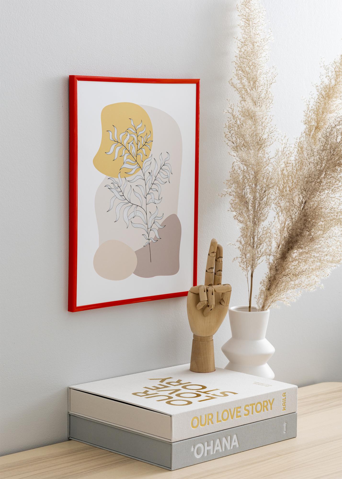 Ramens smala profil på 9,8 mm i bredd och 16,5 mm i djup skapar en elegant omramning, medan den blanka finishen tillför en lyxig känsla. Den svarta passepartouten kompletterar ramens röda färg och framhäver motivet på ett stilfullt sätt.