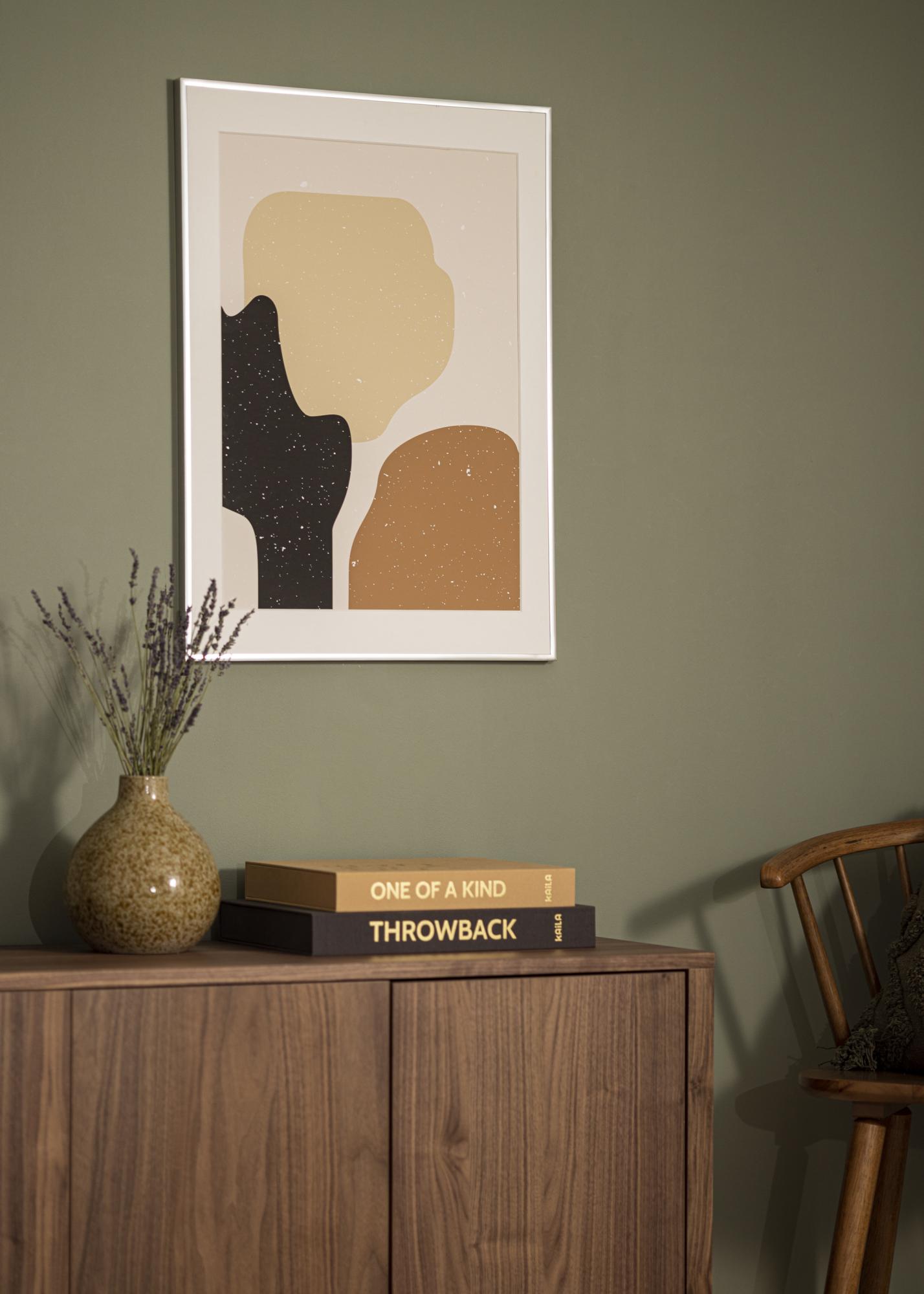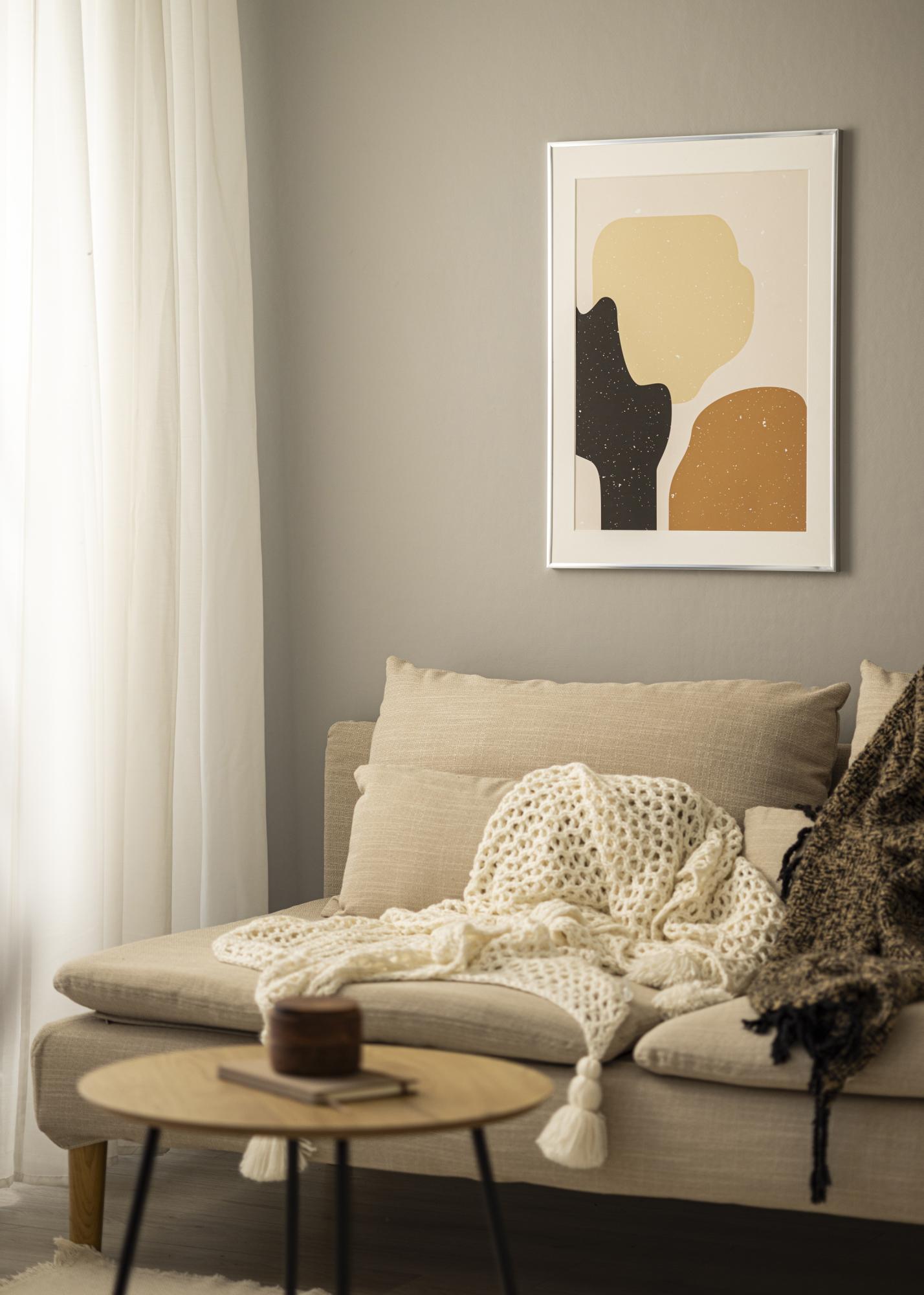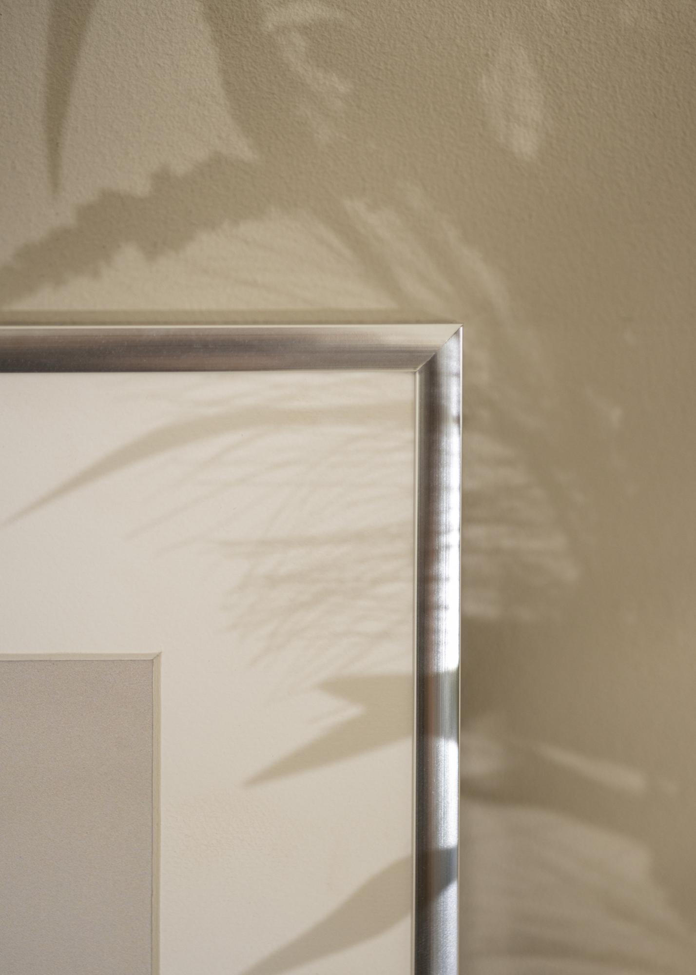 Ramens slanka bredd på 9 mm ger en fin och diskret inramning, medan dess djup på 21 mm skapar en distinkt profil som ger en tredimensionell effekt på väggen. Den blanka ytan på ramen reflekterar ljuset på ett subtilt sätt, vilket bidrar till att lyfta fram bildens färger och detaljer. Passepartoutens vita färg fungerar som en neutral bakgrund som gör att din bild kan tala för sig själv utan att konkurrera med ramen.