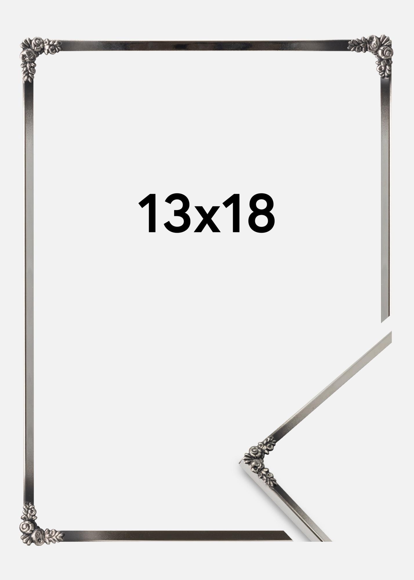 Rosen Metall Silver är en ram i klassisk stil, där varje hörn är dekorerat med små eleganta rosor. Ramen är tillverkad i silverfärgad metall, och har en lätt ”bränd” finish som hjälper till att skapa en extra stilfull känsla. På baksidan finns väggfästen och bakstöd, vilket gör att ramen både kan placeras uppe på väggen och som dekoration på en möbel.