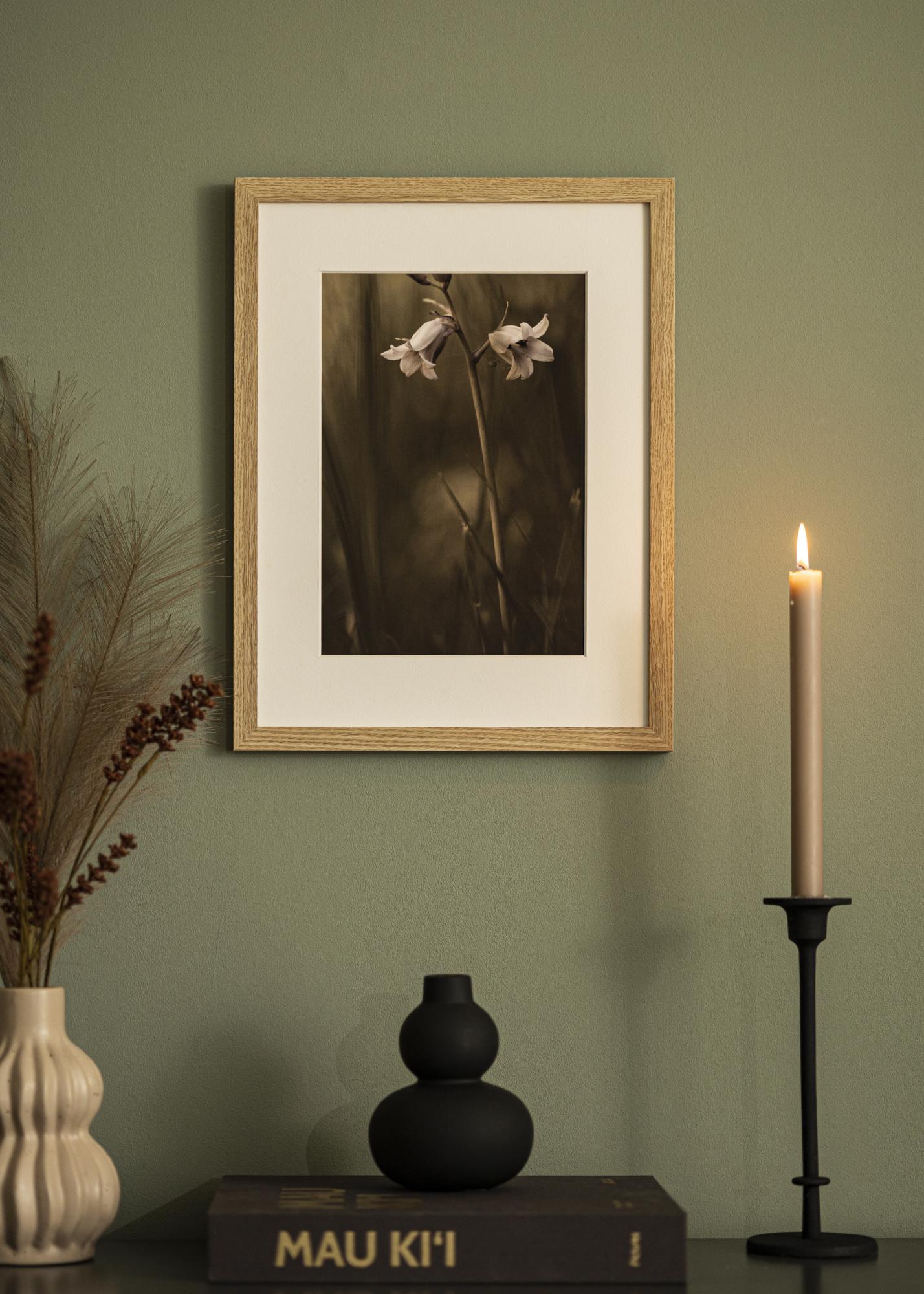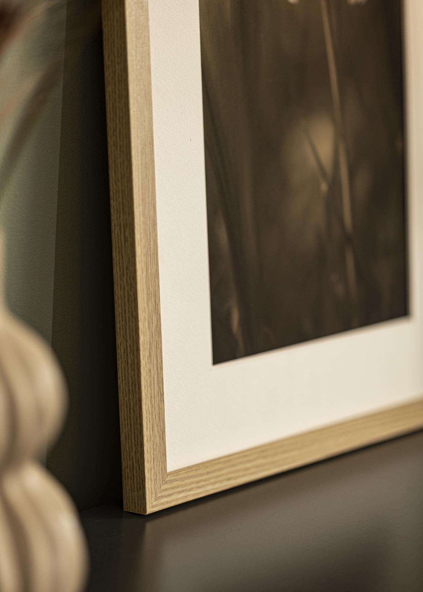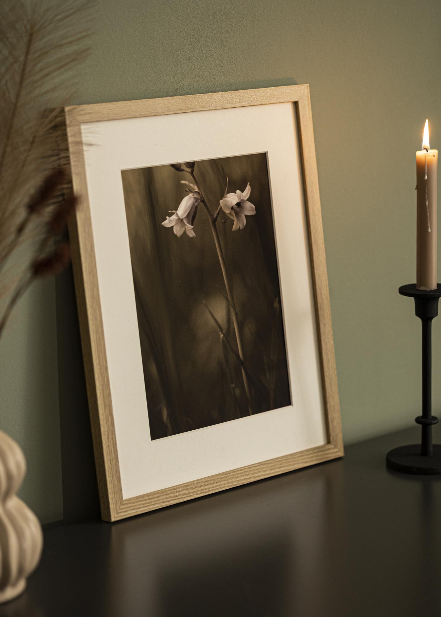 Detta är en ram med en 18 mm bred och djup list med klassisk fyrkantig profil och en vacker yta med trästruktur. Den naturnära framtoningen gör att ramen passar utmärkt till naturmotiv eller moderna bilder som får stå i kontrast till tavelramen. Motiven monteras in i ramen med hjälp av böjbara stift på ramens baksida.