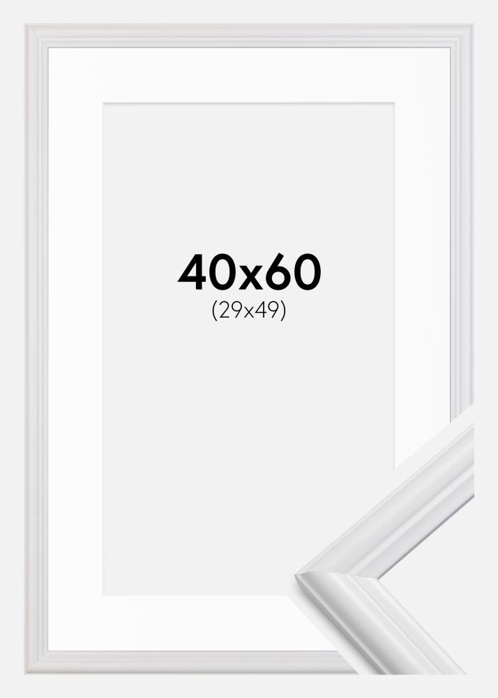 Den vita passepartouten kompletterar ramen och ger en professionell och samlad look, vilket gör att ditt valda motiv verkligen kommer till sin rätt. Ramens yttermått är 43,8x63,8 cm, vilket gör den till en markant men ändå elegant detalj på din vägg.