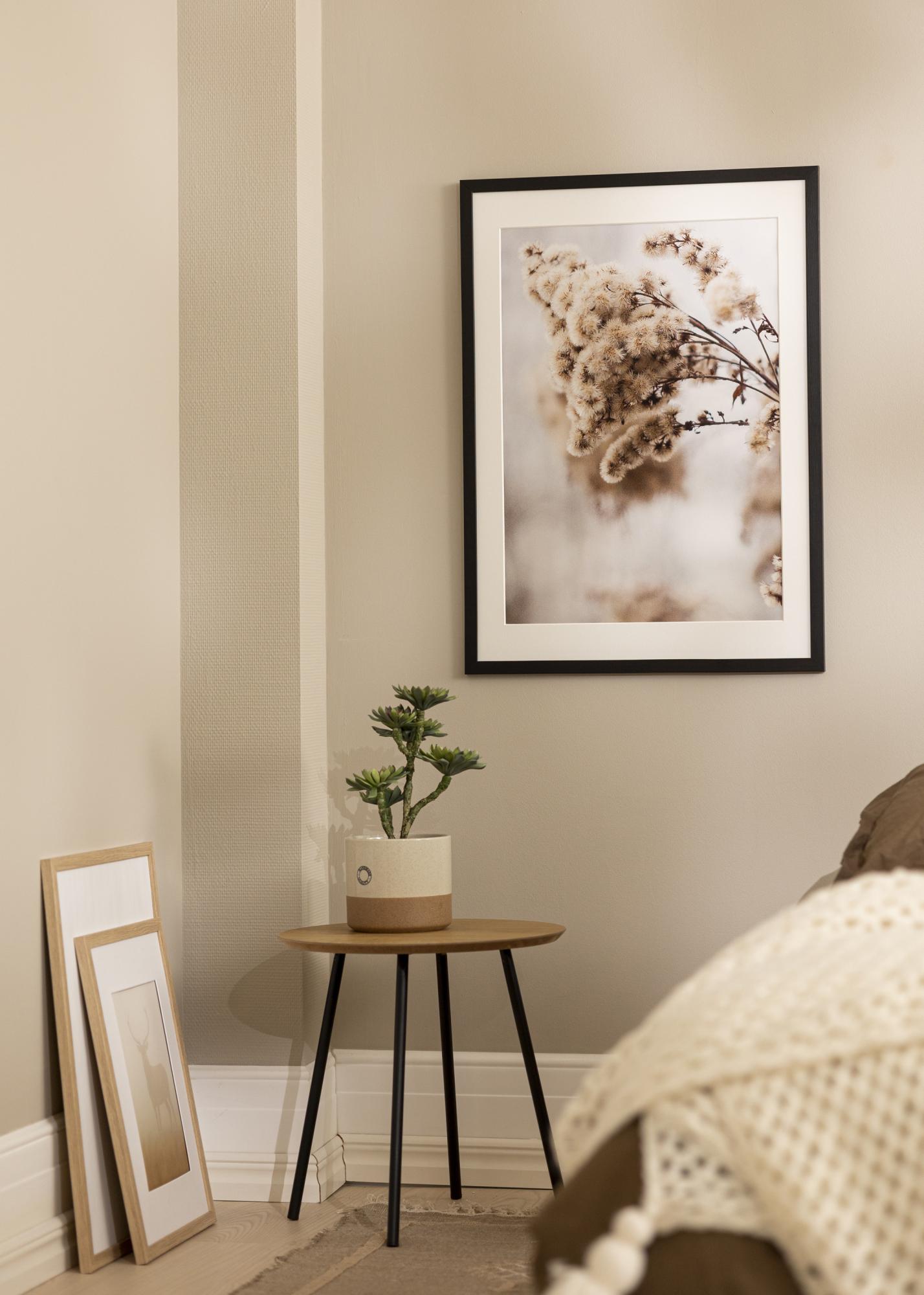 Ramen har en bredd på 20 mm och ett djup på 14 mm, vilket ger en stabil och robust känsla. Den matta ytan i kombination med den svarta färgen ger en tidlös och modern look som passar in i de flesta inredningsstilar. Passepartouten bidrar inte bara till att lyfta fram bilden, utan skyddar även mot att glaset ligger direkt mot motivet, vilket kan förhindra skador och bevara bildens kvalitet över tid.