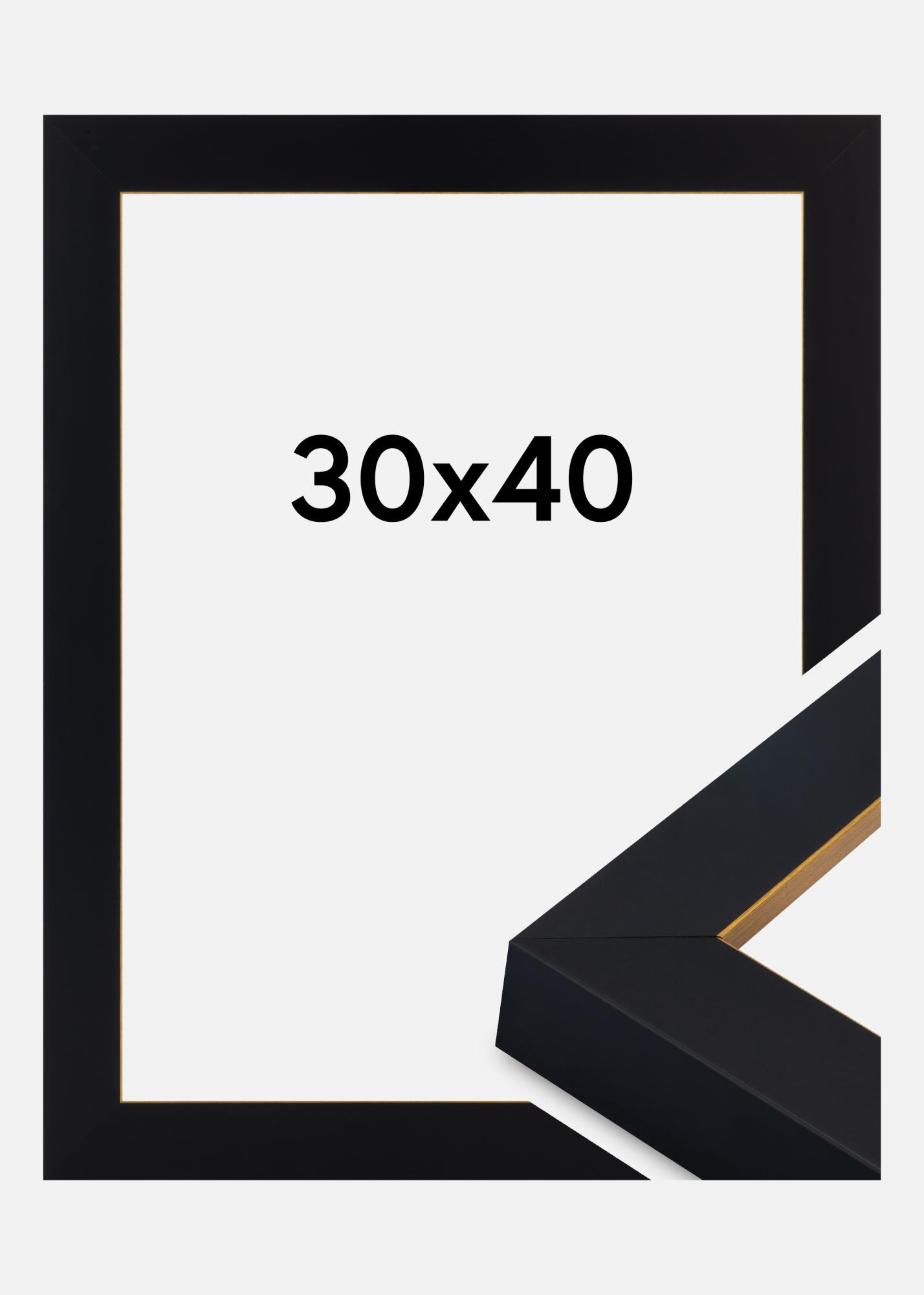 Den här eleganta fotoramen är perfekt för att framhäva dina favoritmotiv i storleken 30x40 cm. Med en modern och stilren design, kombinerar den en slät, blank yta i svart med en elegant guldfärgad kant. Den smala profilen ger ett avskalat och grafiskt uttryck som låter motivet stå i centrum, vilket gör den till ett utmärkt val för både fotografier och posters.