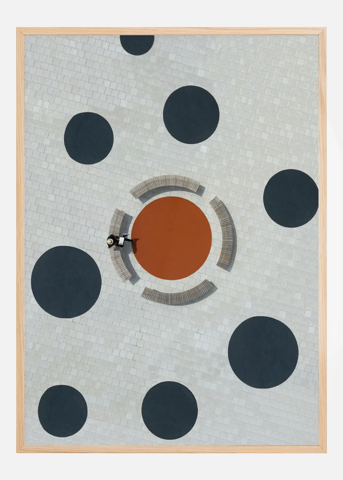 Denna konceptuella poster fångar en distinkt, fågelperspektivbild av en läsande person omgiven av en symmetrisk och grafisk komposition. Den abstrakta designen av den vita kaklade ytan, punkterad med stora svarta cirklar och en central roströd cirkel med bänkar ger en stark visuell kontrast. Denna affisch är inte bara en homage till design och arkitektur, utan även en lekfull tolkning av vardagliga scener.