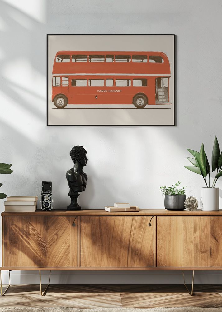 Denna stilrena poster pryder väggen med en ikonisk dubbeldeckarbuss, vilket fångar känslan av klassisk transport i London. Illustrationens elegans och symmetri gör den till en perfekt inredningsdetalj för både hem och kontor. Vår affisch är tryckt med högkvalitativa färger för att säkerställa klarhet och livfullhet i varje detalj.