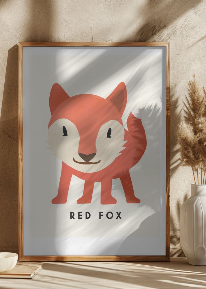 Denna charmiga poster föreställer en stiliserad röd räv, perfekt för att ge en lekfull och varm atmosfär till vilket rum som helst. Motivet framhäver den vänliga räven med dess markerade drag i en enkel och samtida illustration. Detta print är en idealisk väggdekoration för barnrummet eller som en unik gåva för djurälskaren. De dominerande färgerna i denna affisch är skiftningar av rött och beige, med svarta och vita detaljer som bidrar till en ren och sofistikerad känsla.