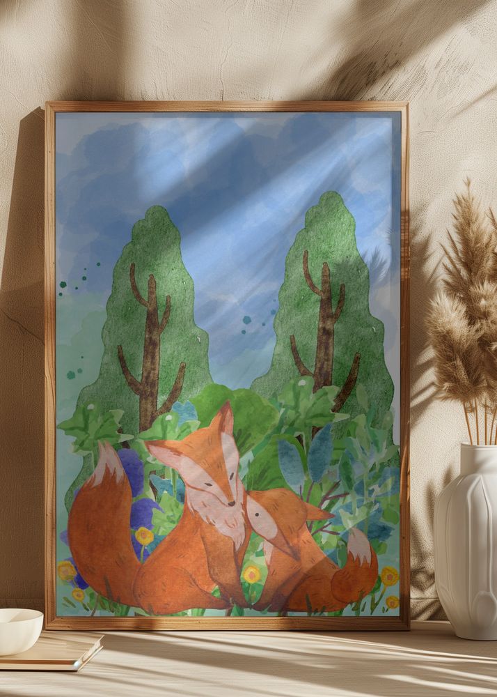 Denna charmiga poster porträtterar en öm och idyllisk scen med två rödrävar som delar ett kärleksfullt ögonblick omgivna av en frodig natur. Djurens päls skiftar i varma nyanser av orange och brun, vilket ger en känsla av värme och trygghet. Den livfulla illustrationen är utformad med penseldrag som för tankarna till en vattenfärgsmålning och skulle passa perfekt i ett barnrum eller som en del av en naturinspirerad tavelsamling.