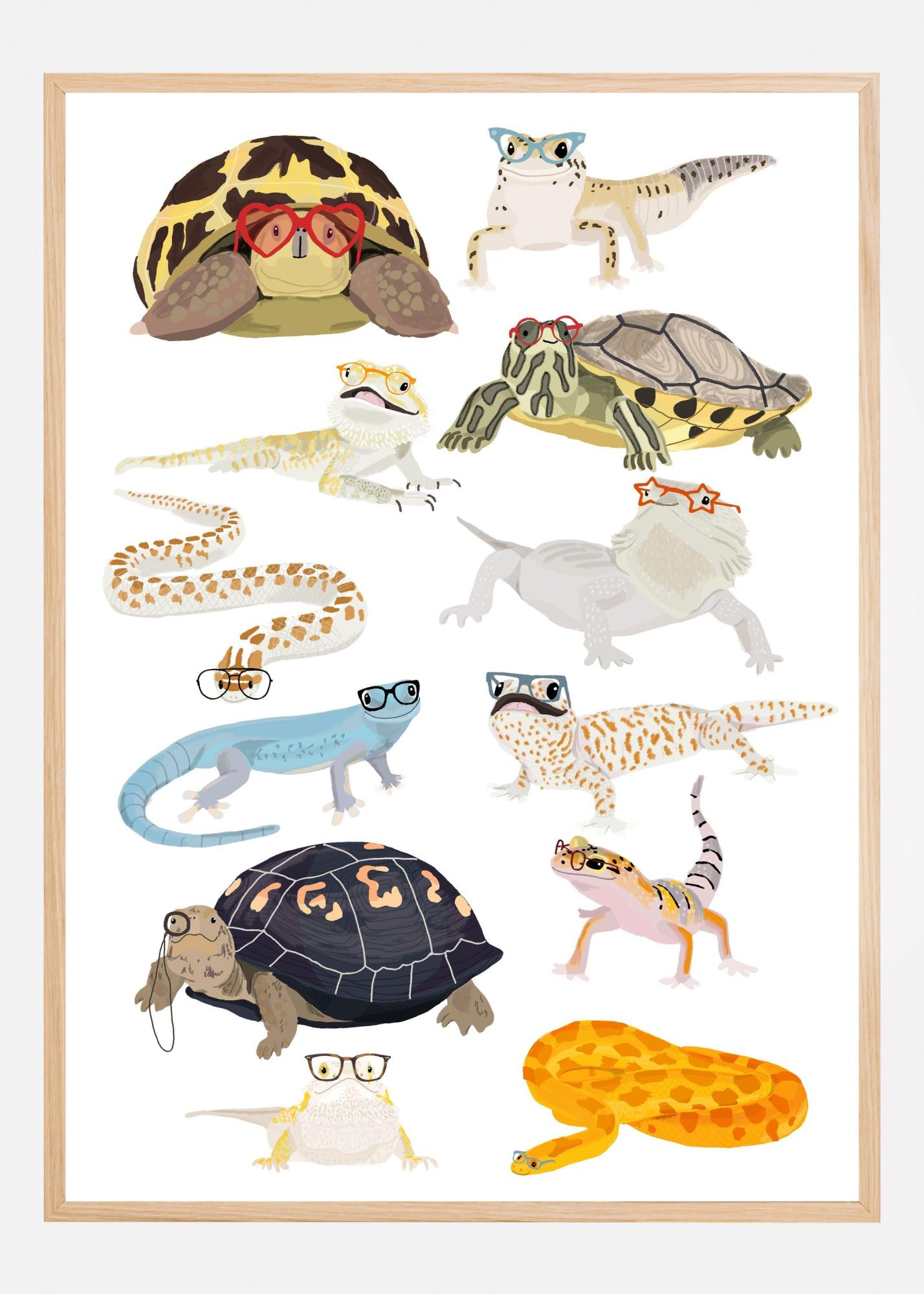 Denna charmiga och lekfulla poster är en riktig blickfångare med sitt unika motiv bestående av olika arter av reptiler och amfibier iförda glasögon, vilket ger varje djur en personlighet och individuell stil. Illustrationerna är mjukt tecknade med en färgpalett som innehåller nyanser av grönt, brunt, beige, gult och små inslag av rött, vilket förhöjer den roliga och barnvänliga känslan i denna affisch. Bilden erbjuder en distinkt mix av humor och stil som kan tilltala både barn och vuxna, och passar perfekt i ett rum som behöver lite lättsam charm.