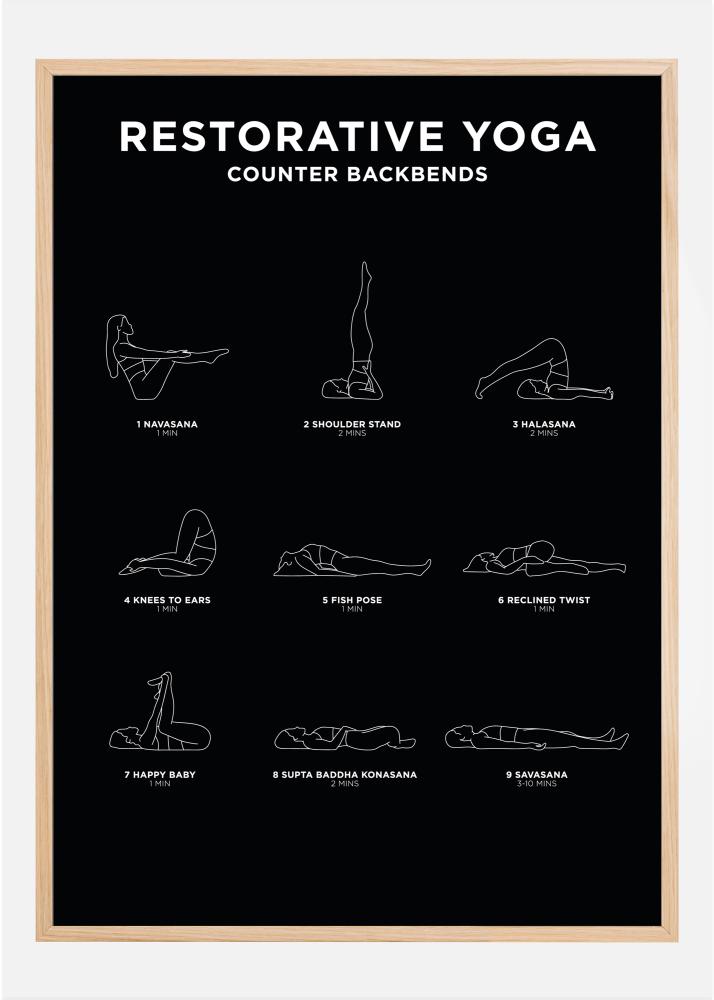 Lär dig slappna av med Restorative yoga. Denna stilfulla poster är inte bara en snygg inredningsdetalj, den ger dig också konkreta instruktioner för positioner inom denna avslappnande yogastil.