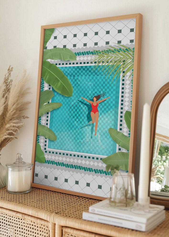 Upplev sommarens lugn med vår trendiga poster som fångar en avkopplande poolscen. Bilden visar en person som njuter av vattnets stillhet, omgiven av grönskande palmblad som omsluter den turkosa poolen. Det är en affisch som tar med sig en känsla av semester och avslappning, perfekt för att skapa en rogivande atmosfär i hemmet.