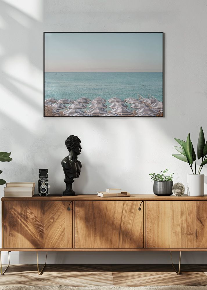 Denna poster fångar den avkopplande atmosfären vid stranden, där randiga parasoll i blått och vitt breder ut sig längs sanden. Havets klara blå nyans smälter samman med himlens mjuka pasteller, vilket skapar en känsla av lugn och sommarvärme. Affischen är perfekt för den som vill addera en känsla av semester och hav till sitt hem.