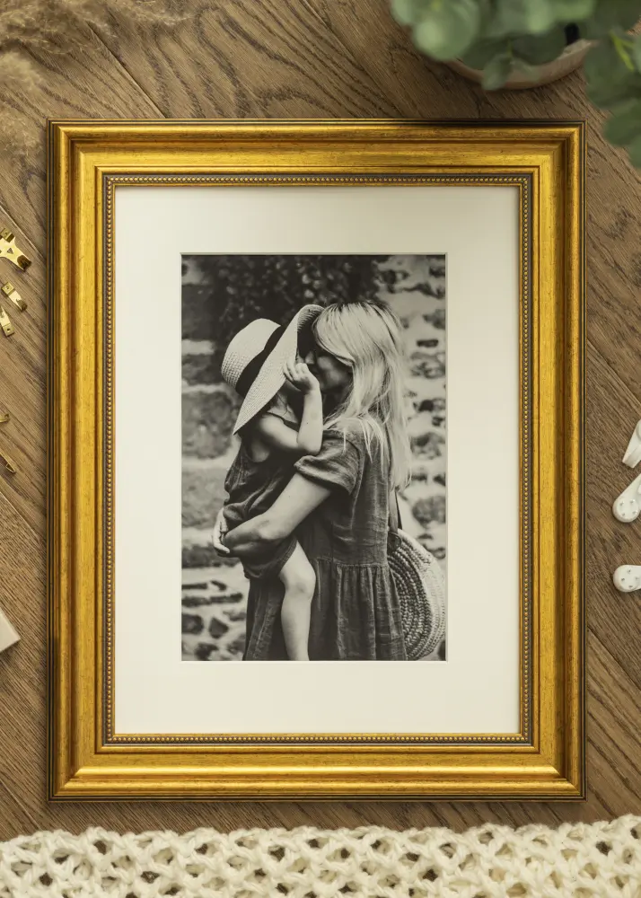 Med sin imponerande design och gyllene glans är denna ram ett utmärkt val för att framhäva allt från familjefoton till diplom. Den tjänar inte bara som en skyddande omfattning för dina värdefulla minnen utan också som ett konstverk i sig.