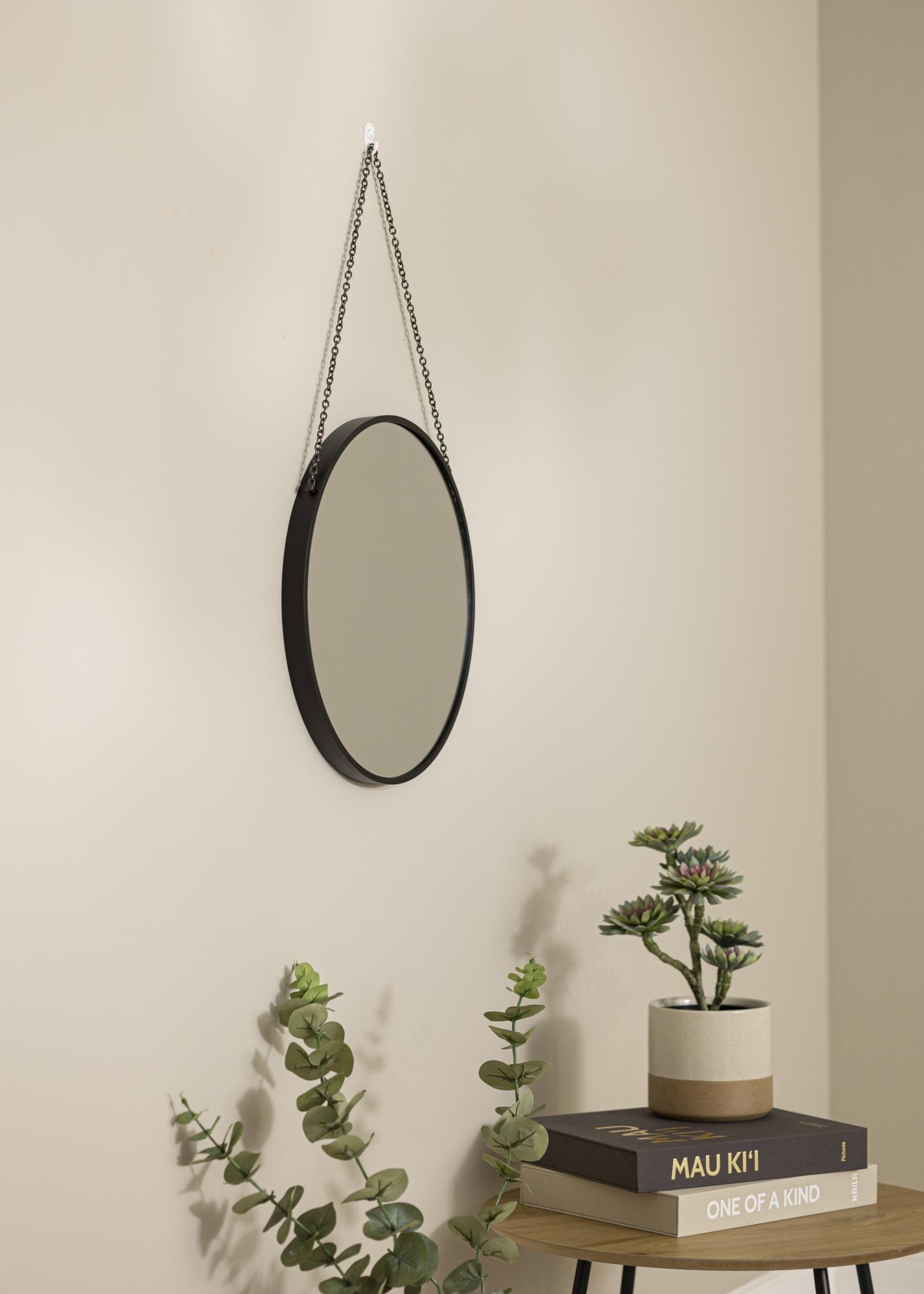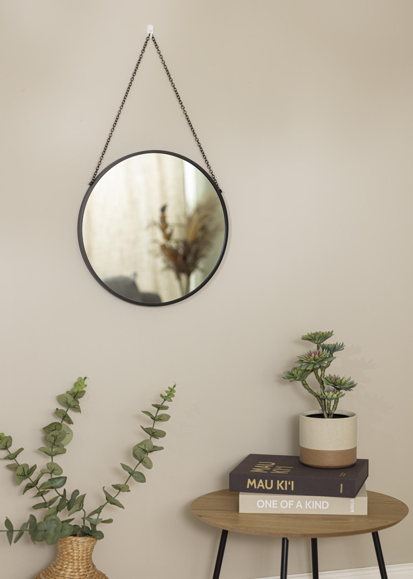 En rund spegel är en klassiker av en anledning! Den mjuka formen skapar stor elegans i ditt hem och bryter av mot raka linjer i inredningen. Detta är en modell med en djup ram på hela 28 mm och en stilfull svart nyans som enkelt kan matchas med andra inredningsdetaljer. Spegelramen är tillverkad i metall. Spegeln hängs upp i en svart kedja, vilket förhöjer känslan av elegans ännu mer.