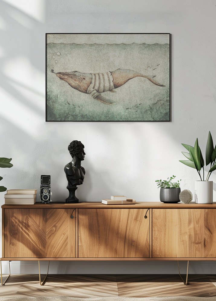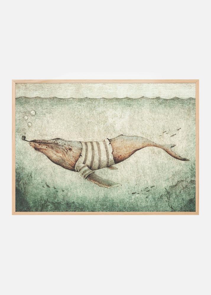 Denna unika poster föreställer en kreativ illustration av en val i en randig tröja, simmande genom ett lugnt undervattenslandskap. Den har en drömsk och konstnärlig stil som förvandlar vilket rum som helst till en visuell upplevelse. Perfekt för dem som uppskattar maritima teman med en lekfull twist.