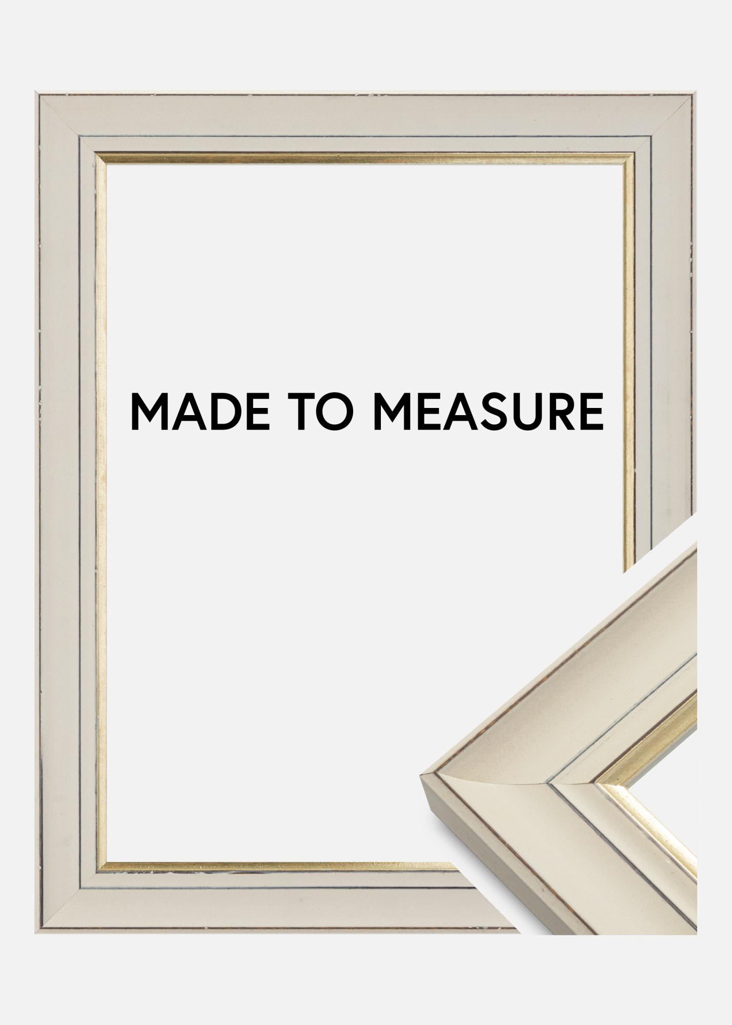 Fotoram i klassisk stil med en spännande retrokänsla. Ramen har en nött profil i vitt med en snygg guldkant närmast motivet, med sin neutrala design och färgval är detta en ram som passar i nästan alla miljöer och till alla typer av motiv.