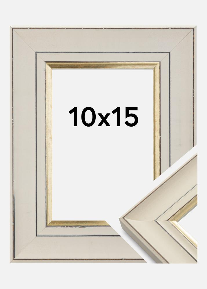 Fotoram i klassisk stil med en spännande retrokänsla. Ramen har en nött profil i vitt med en snygg guldkant närmast motivet, med sin neutrala design och färgval är detta en ram som passar i nästan alla miljöer och till alla typer av motiv.