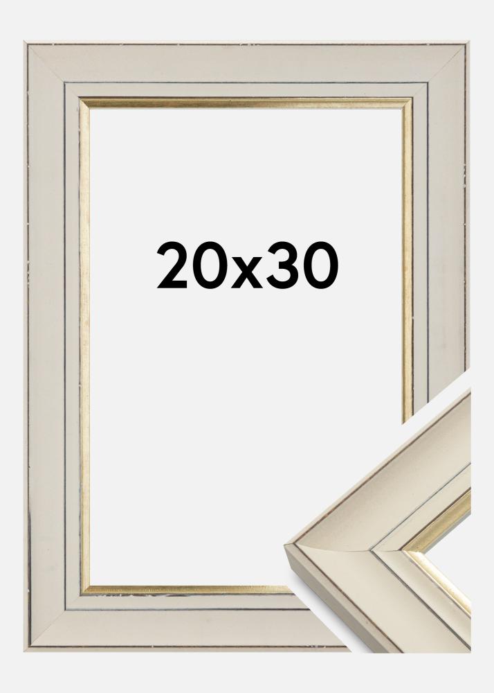 Fotoram i klassisk stil med en spännande retrokänsla. Ramen har en nött profil i vitt med en snygg guldkant närmast motivet, med sin neutrala design och färgval är detta en ram som passar i nästan alla miljöer och till alla typer av motiv.