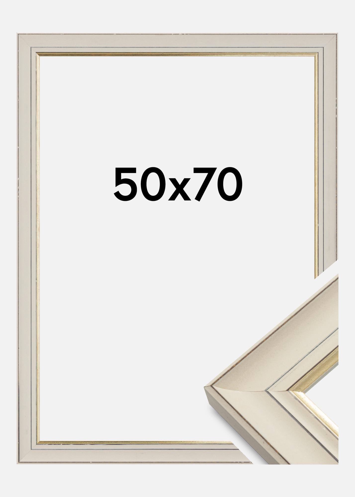 Fotoram i klassisk stil med en spännande retrokänsla. Ramen har en nött profil i vitt med en snygg guldkant närmast motivet, med sin neutrala design och färgval är detta en ram som passar i nästan alla miljöer och till alla typer av motiv.