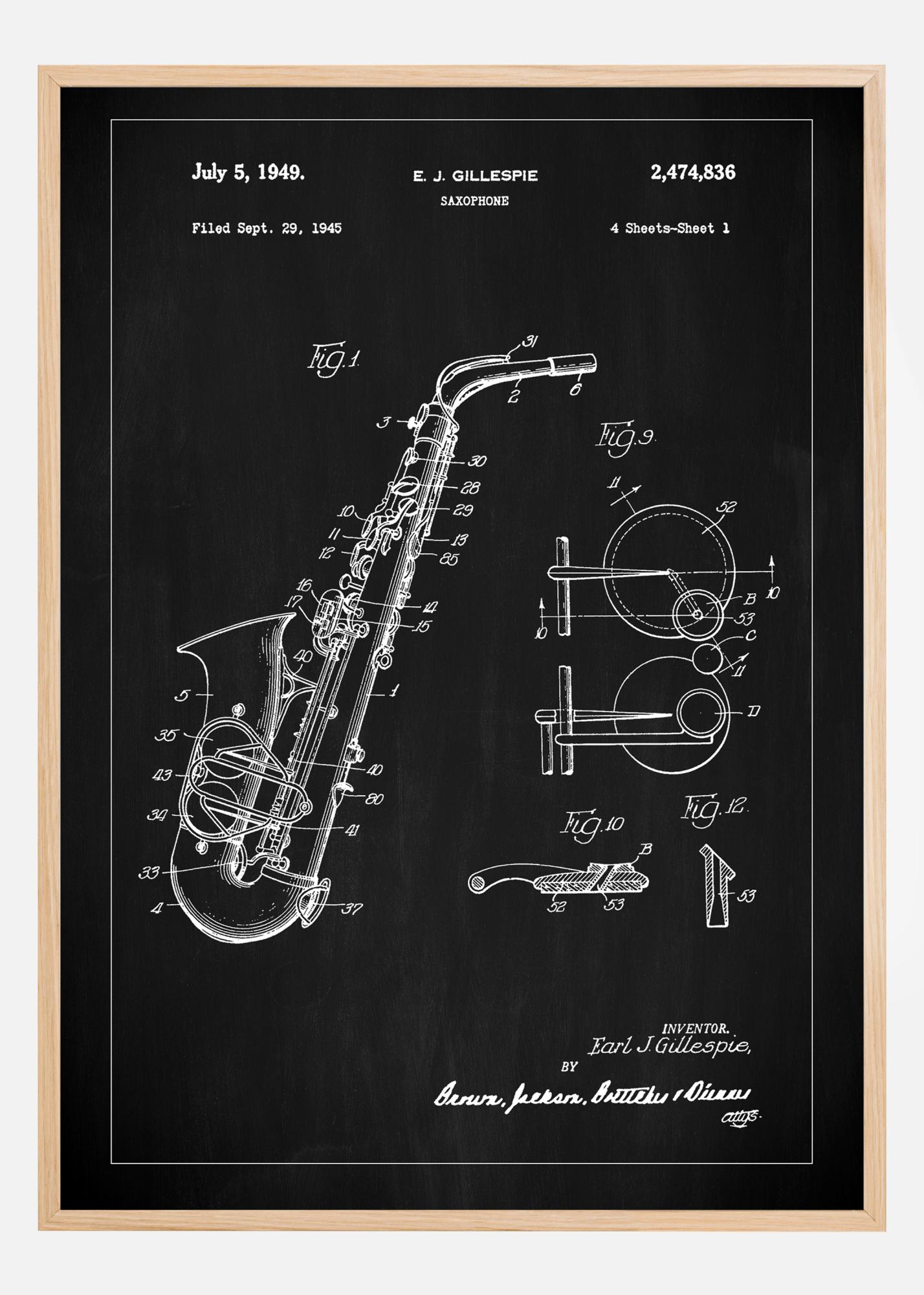 Det svarta bakgrunden ger en djärv och modern kontrast som lyfter fram de vita linjerna och skapar en slående visuell effekt som fångar betraktarens uppmärksamhet. För jazzentusiaster, musikhistoriker, och designälskare erbjuder denna patentritning ett konstnärligt och historiskt perspektiv på ett av de mest ikoniska musikinstrumenten genom tiderna. En patent affisch som denna är mer än bara en inredningsdetalj; det är en hyllning till innovationen och det musikaliska uttrycket som saxofonen representerar.
