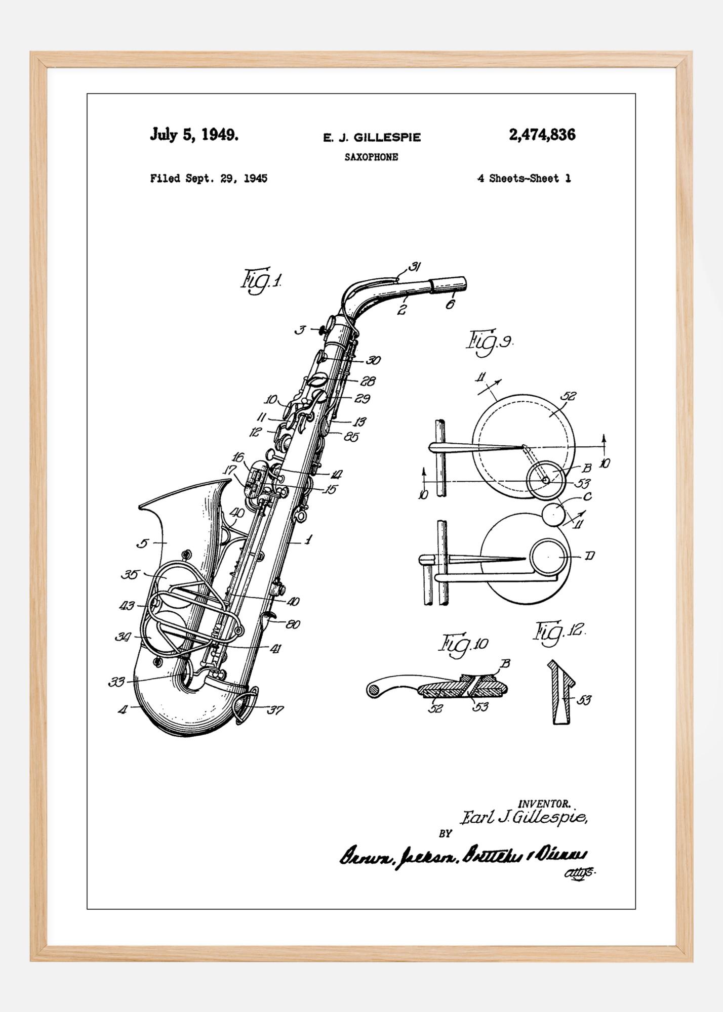 Denna noggrant detaljerade patentposter presenterar en saxofons patentritning, daterad den 5 juli 1949. Det är ett enastående exempel på musikinstrumentets tekniska konstruktion och design, framhävd av patentets klara linjer och precisa märkningar. För musikälskare, instrumentmakare, och konnässörer av sällsynta diagram är denna patent affisch en stilig hyllning till den kreativa processen bakom tillverkningen av ett saxofon.