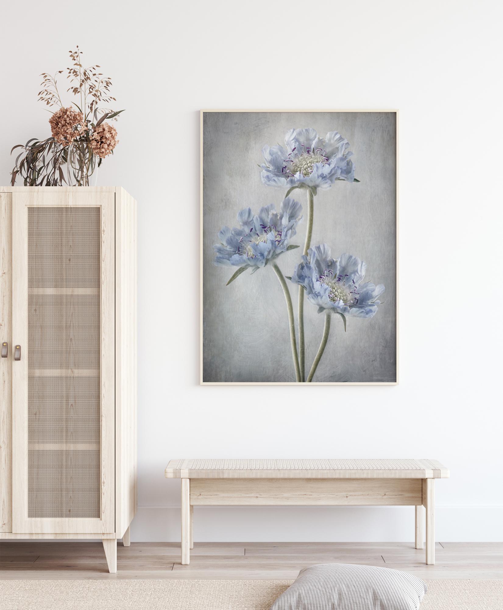 En eterisk poster med tre Scabiosa mot en mjuk ljusblå vägg. De förtjusande blå kronbladen krullar sig uppåt i den här fantastiska målningen. Blommorna belyses av den blekare vita bakgrunden för att få dem att sticka ut. Vakna upp till detta fridfulla stilleben i ditt sovrum.
