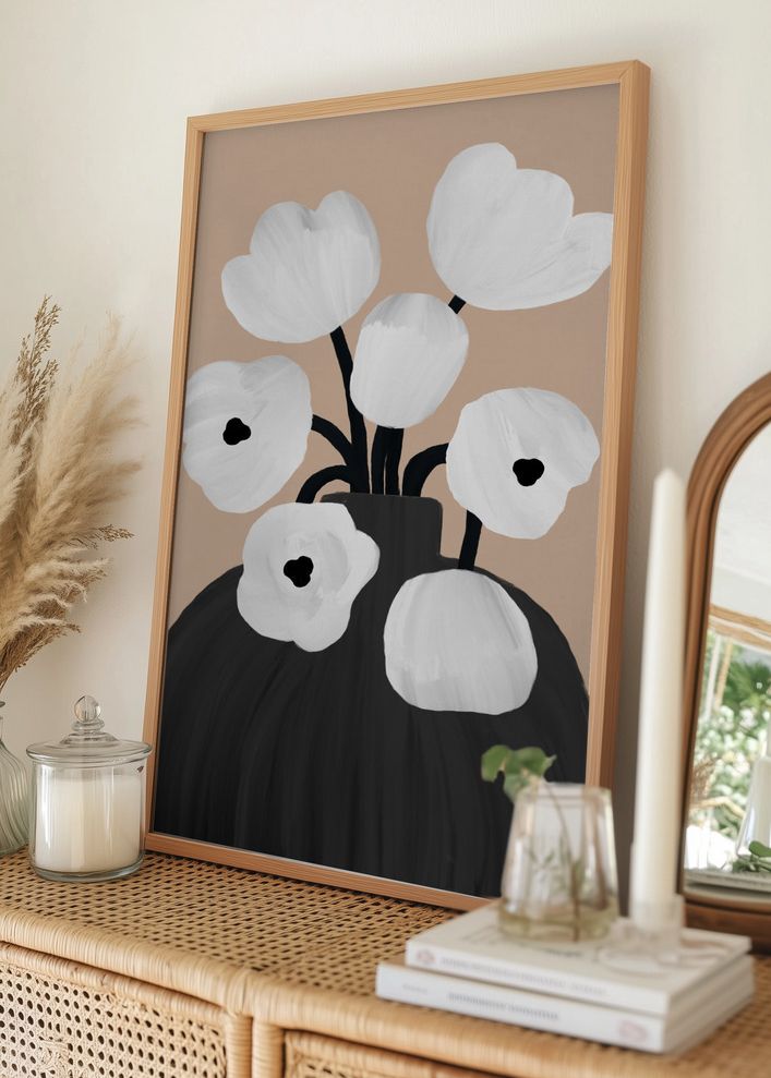 Blommornas vita nyanser står i fin kontrast till vasens mörka, nästan svarta färg, vilket ger en djup och intressant visuell effekt. Detta konstverk blir ett uttrycksfullt inslag i varje rum och är enkelt att kombinera med andra dekorativa element. Låt denna affisch sätta tonen i ditt hem och bli ett samtalsämne vid varje tillfälle.