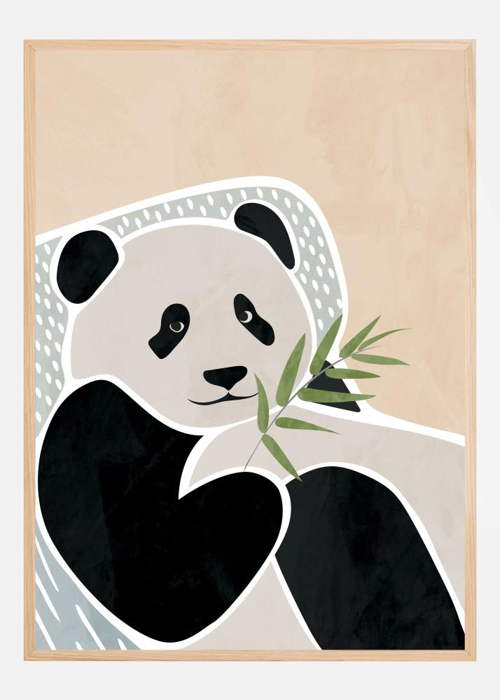 I motivet framträder en palett av lugna och neutrala färger som omfamnar beige, svart, vitt och en touch av pastellgrönt och blått för att skapa en fridfull känsla. Denna affisch är en elegant inredningsdetalj som sätter en personlig prägel på din vägg och blir en omedelbar blickfångare. Bildens bakgrund i subtil beige, tillsammans med pandans konturer och den stiliserade bambun, gör detta verk till ett måste för den som uppskattar skönhet och natur i sin inredning.