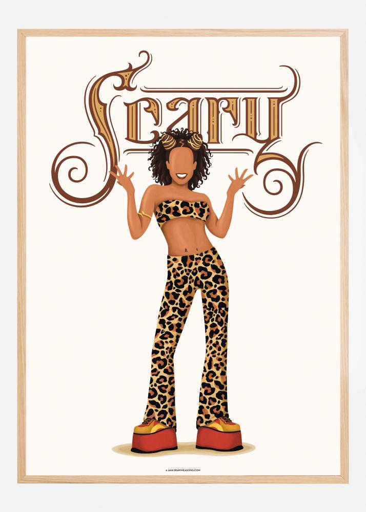 Färgschemat i denna print är fokuserat runt nyanserna av brun, svart och beige, som karaktäriserar det ikoniska leopardmönstret. Personens hudton är harmoniskt illustrerad med varma toner, mot en ren och enkel bakgrund som får de intensiva färgerna i kläderna att sticka ut. Med detta konstverk får du ett statement piece som tar för sig i rummet, samtidigt som de jordnära nyanserna gör att det lätt kan passa in i många olika inredningsstilar.