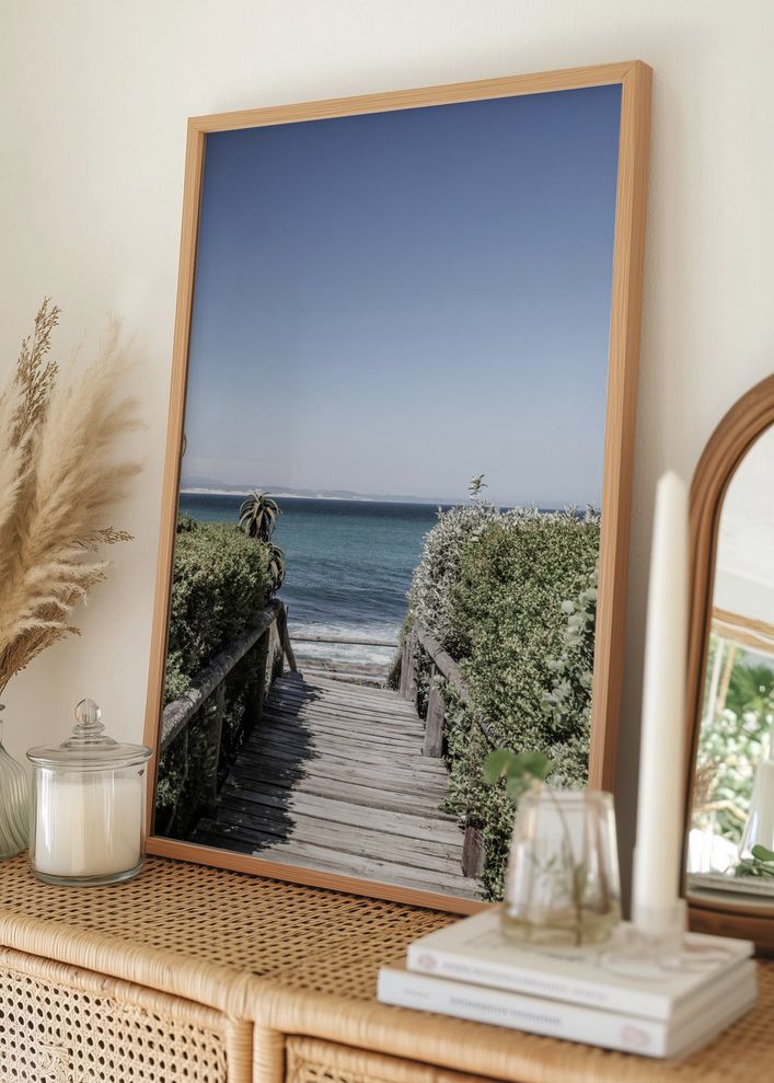 Denna poster fångar den rogivande skönheten vid kusten och visar en trätrappa som leder ner till det spegelblanka havet. Stigen är omgiven av frodig grönska som ger en känsla av harmonisk inramning. Perfekt för att skapa en lugnande atmosfär i ditt hem, förstärker denna print känslan av frihet och naturlig skönhet.