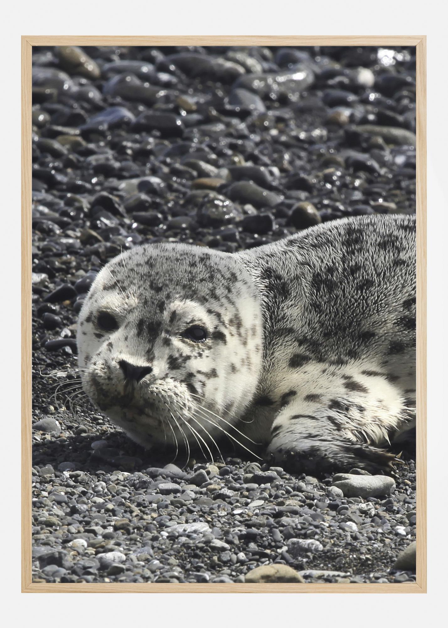 En vacker djurposter med en säl på en klippig strand. En gråsäl ligger på klipporna, nästan helt kamouflerad. Fläckarna på dess päls speglar stenarna bakom. Stirra in i de själfulla ögonen på detta marina däggdjur när du tar med dig den här bilden hem.